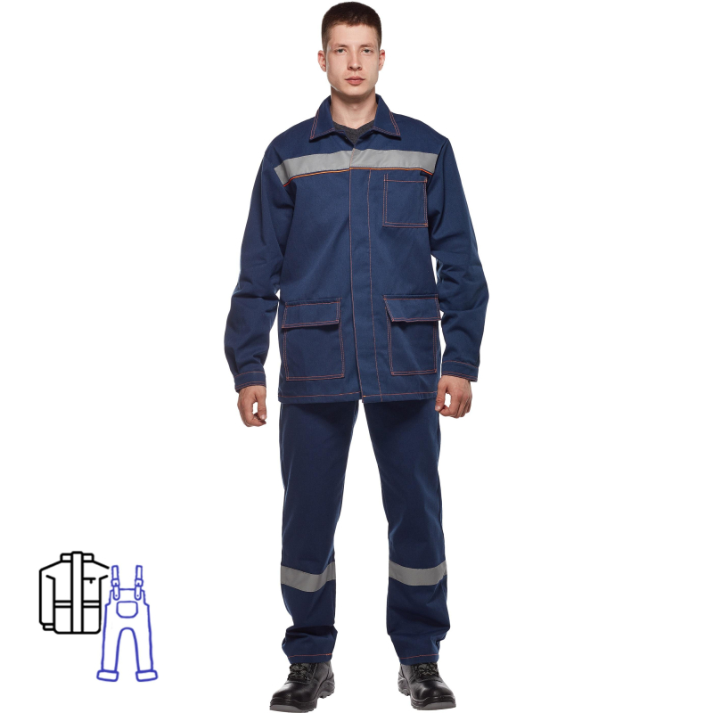 Костюм рабочий летний мужской л28-КПК с СОП состоит из куртки и полукомбинезона. Размер: 60-62. Рост: 170-176. Темно-синего цвета с контрастной отстрочкой и оранжевым контрастным кантом. Изготовлен из смесовой ткани (65% хлопок, 35% полиэстер), плотность ткани - 240 г/кв.м. За счет оптимального соотношения хлопка и полиэфирных волокон дают высокие эксплуатационные характеристики, не мнется, костюм держит свою первоначальную форму даже после многократных стирок, не требует глажки, износостойкий. Благодаря матовой поверхности ткани одежда выглядит презентабельно и аккуратно. Куртка с супатной застежкой на пуговицы. СОП на груди и спине. Многофункциональные карманы на полочках куртки. Полукомбинезон с многофункциональными карманами на брючинах и грудке. СОП на обеих ногах. Бретели регулируются по длине. Костюм обеспечивает защиту от общих производственных загрязнений, от механических повреждений, от истирания. Отрасль: логистика, легкая промышленность, тяжелая промышленность, строительство, ЖКХ, озеленение, агропромышленный комплекс. ГОСТ 12.4.280-2014.