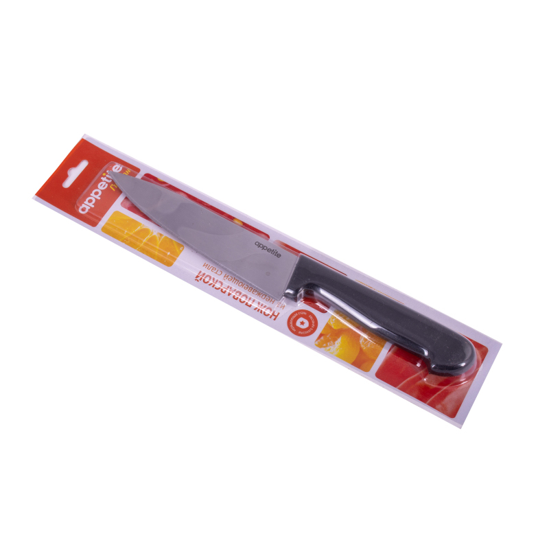 Нож кухонный Appetite Гурман изготовлен из нержавеющей стали с удобной пластиковой ручкой. Такой нож предназначен для нарезки овощей, фруктов, сыра, небольших буханок, хлеба, булочек, масла и других продуктов. Лезвия долгое время остаются острыми и не требуют частого затачивания. Этот прибор предназначен для резки продуктов с минимальным усилием, по этой причине его нужно использовать с осторожностью. Эргономическая рукоятка удобно ложится в руке, не скользит и обеспечивает комфортное использование прибора. После использования прибор следует вымыть в теплой воде и вытереть насухо.