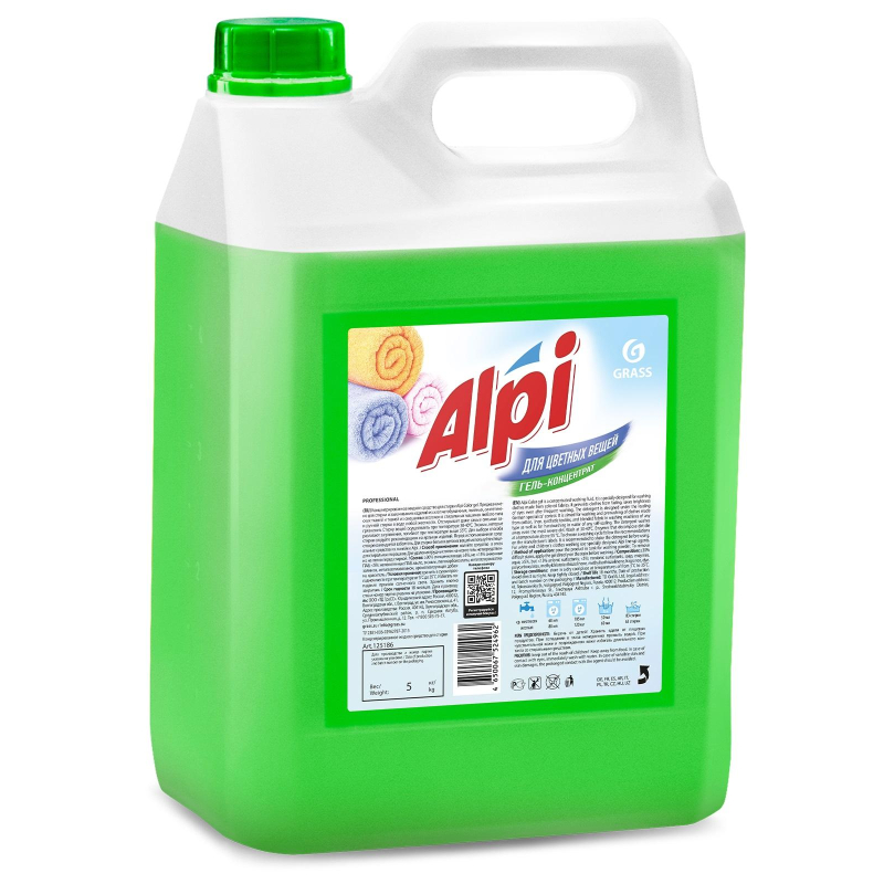 Гель для стирки Grass Alpi 5 л (концентрат). Назначение: концентрированное жидкое средство для стирки Alpi Color gel. Предназначено для стирки и замачивания изделий из хлопчатобумажных, льняных, синтетических тканей и тканей из смешанных волокон в стиральных машинах любого типа и ручной стирки в воде любой жесткости. Отстирывает даже самые сильные загрязнения. Стирку вещей осуществлять при температуре 30-40°С. Энзимы, которые разлагают загрязнения, погибают при температуре выше 55°С. Для выбора способа стирки следуйте рекомендациям на ярлыках изделий. Перед использованием средство рекомендуется взболтать. Для стирки белых и детских вещей используйте специальные средства из линейки Alpi. Способ применения: для выбора способа стирки и температуры воды следуйте рекомендациям на ярлыках изделий. Перед использованием средство необходимо взболтать. Для автоматической стирки: 60 мл концентрата (один мерный колпачок) на 3-5 кг белья (для жесткой воды 80 мл); 105 мл концентрата на 6-8 кг белья (для жесткой воды 120 мл). Для ручной стирки: концентрат разбавить в пропорции 5 мл/л (для жесткой воды 6 мл/л), т. е. 50 мл (для жесткой воды 60 мл) на 10 л воды. Условия хранения: хранить в сухом прохладном месте при температуре от 5 до 35 вдали от отопительных приборов. Избегать попадания прямого солнечного света. Хранить плотно закрытым. Состав: ?30% очищенная вода, ?5%, но