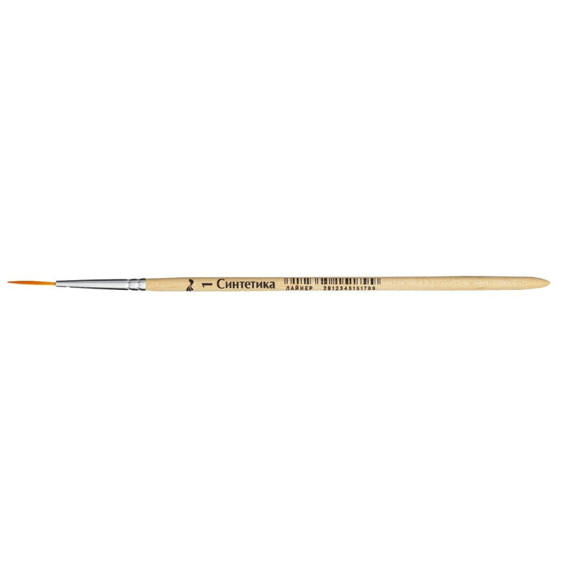 Кисть лайнер или шрифтовая №1. Это подвид круглых кистей с длинным пучком, используются для нанесения и закрепления контуров. Изготовлена из синтетики на короткой деревянной ручке (14 см). Применяется для работы с гуашью, темперой, акрилом. Без упаковки.Товар относится к ценовому сегменту "суперэконом". Имеет упрощенные характеристики и более простую упаковку. Отвечает основным требованиям потребления.