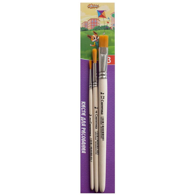 Набор состоит из кистей, изготовленных из синтетического волокна круглой (№2, 4) и плоской (№12) формы. Кисти по своим свойствам жесткие и упругие. Кисти упаковываются в полиэтиленовый пакет с европодвесом. Короткие деревянные ручки (от 14 до 16 см в зависимости от номера кисти). Применяется для работы с акварелью, акрилом, гуашью, тушью.Товар относится к ценовому сегменту "суперэконом". Имеет упрощенные характеристики и более простую упаковку. Отвечает основным требованиям потребления.