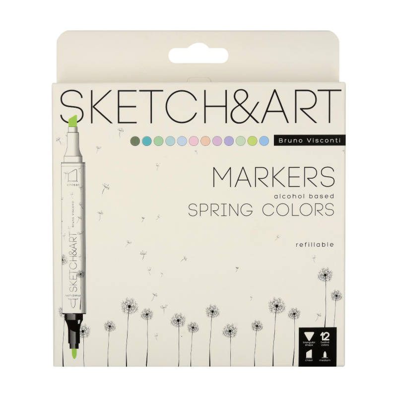 Набор из 12 маркеров для скетчинга Sketch&Art. Для создания настоящих шедевров нужно больше цветов. На такой случай всегда есть тематические наборы с множеством дополнительных оттенков. Выбирайте из множества коллекций, рисуйте пейзажи, портреты или яркие абстракции. К вашим услугам: эргономичная форма, идеально прилегающие колпачки, два классических наконечника, большой запас чернил. Имеет две формы наконечника: клиновидный (5 мм) и пулевидный (1 мм). Используются для скетчинга.