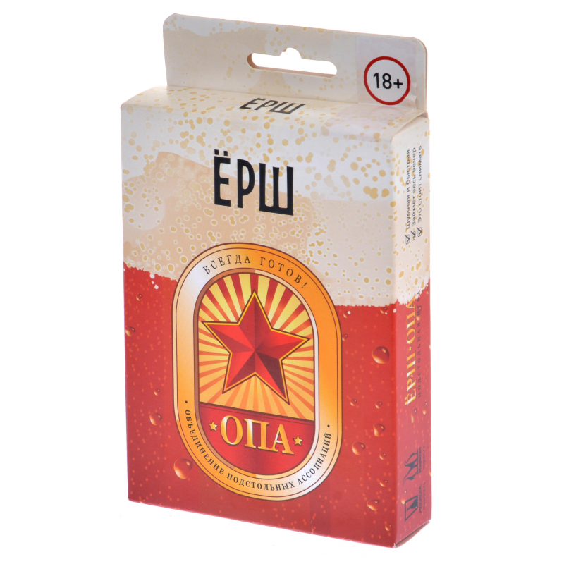 Настольная игра Ерш Опа Ерш - алкогольная застольная игра, которая помогает отлично провести время в компании. Внутри коробки карточки с заданиями и карточки бонусов. Общий принцип - нужно выполнять задания или пить штрафную. Для кого эта игра? - Для тех, кто всегда готов хорошенько повеселиться. - Организаторам мероприятий, на корпоративы и выезды. - Для тех, кто не за рулем, но любит драйв. - Для иностранцев, разгадывающих все наши секреты. - Презент душе компании. Комплектация: - 95 карт безумных заданий; - 5 карт бурых медведей, которые ознаменуют приближение конца игры; - Правила игры.