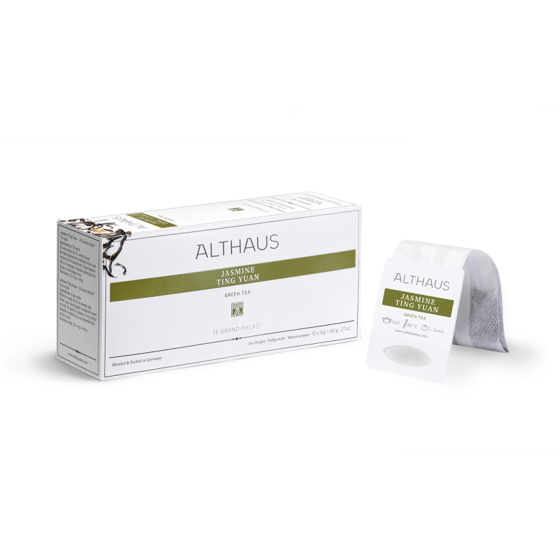 Чай Althaus Jasmine Ting Yuan зеленый 15 пакетиков. Althaus Jasmine Ting Yuan изготавливается по традиционной китайской технологии, во время которой отборный зеленый чай смешивается с еще нераскрывшимися бутонами белоснежного жасмина. Чай, насыщенный эфирными маслами летних цветов, оказывает гармонизирующее воздействие на организм человека и обладает расслабляющим эффектом. Состав: чай зеленый байховый, ароматизатор ?натуральный жасмин?. Способ приготовления: заваривать в течении 2-3 минут при температуре воды 80°С. Тип упаковки: картонная. Хранить в сухом месте. Страна производства: Германия.