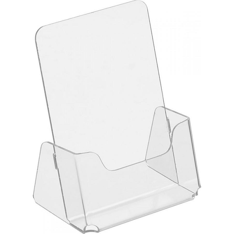 Настольная вертикальная подставка под визитки. Вертикальное расположение. Предназначена для одностороннего размещения. Вместимость подставки - 20 мм. Изготовлена из прозрачного акрилового оргстекла. Поставляется в защитной пленке. Размеры (ВxШxГ): 90x57x20 мм.