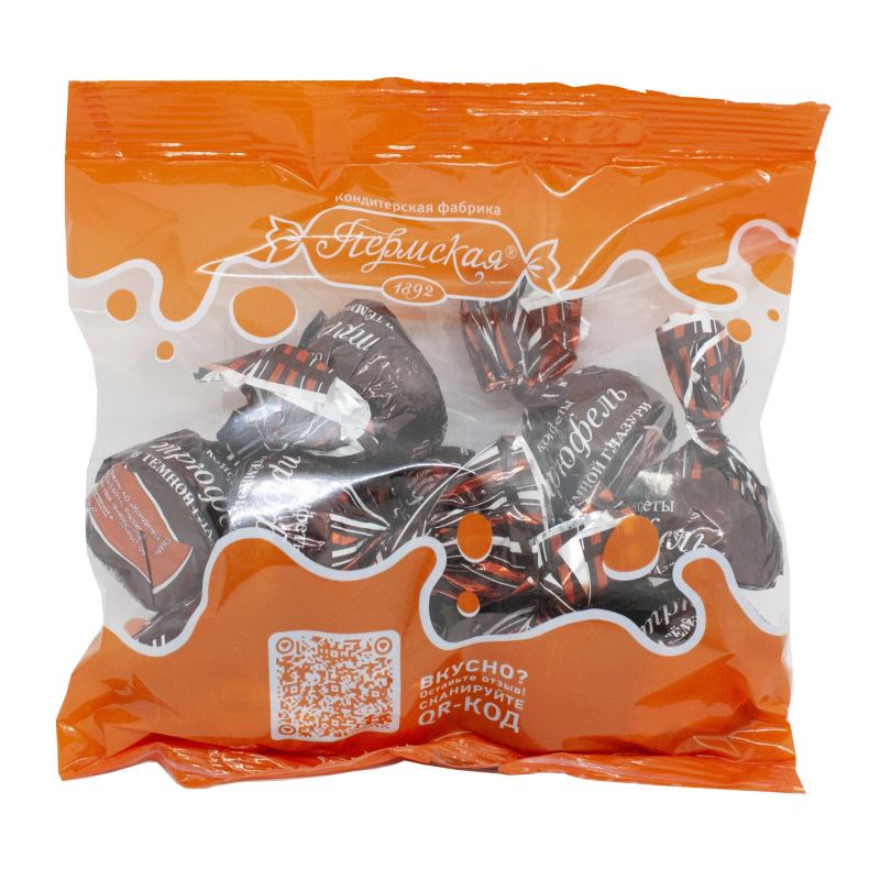 Нежная, тающая во рту конфета с насыщенным сливочным вкусом, легким ароматом ванили и пряной корицы, покрытая тонкой глазурью. Эти конфеты отличают умеренная сладость, легкая трюфельная горчинка и запоминающиеся вкусовые ощущения. Конфеты куполообразной формы упакованы в пленку с традиционным оформлением. Вес: 200 г. Состав: сахар, какао-порошок, заменитель масла какао нетемперируемый нелауринового типа (рафинированные дезодорированные растительные масла в натуральном и модифицированном виде, в том числе соевое, эмульгатор соевый лецитин, антиокислитель Е306), сыворотка молочная сухая, масло кокосовое рафинированное дезодорированное отбеленное, эмульгатор лецитин соевый, ароматизатор ванилин, корица молотая, комплексная пищевая добавка - антиокислитель (носитель Е432, вода очищенная, антиокислитель Е300, носитель - триглицериды жирных кислот, антиокислитель Е307), глазурь (сахар, заменитель масла какао нетемперируемый нелауринового типа (рафинированные дезодорированные растительные масла в натуральном и модифицированном виде, в том числе соевое, эмульгаторы: Е492, Е322, антиокислитель Е306), какао-порошок, эмульгатор лецитин соевый, комплексная пищевая добавка - антиокислитель (носитель Е432, вода очищенная, антиокислитель Е300, носитель - триглицериды жирных кислот, антиокислитель Е307), ароматизатор ванилин). Продукт может содержать следы арахиса, пшеничного глютена, орехов, яичных продуктов. Пищевая ценность в 100 г продукта, г: белки - 7,0, жиры - 31,0, углеводы - 48. Энергетическая ценность в 100 г: 2050 кДж (490 ккал). Срок годности: 8 месяцев. Хранить при температуре от 15 до 21°C и относительной влажности воздуха не более 75%. Не подвергать воздействию прямого солнечного света. Страна производства: Россия. Производитель: АО "Кондитерская фабрика "Пермская"