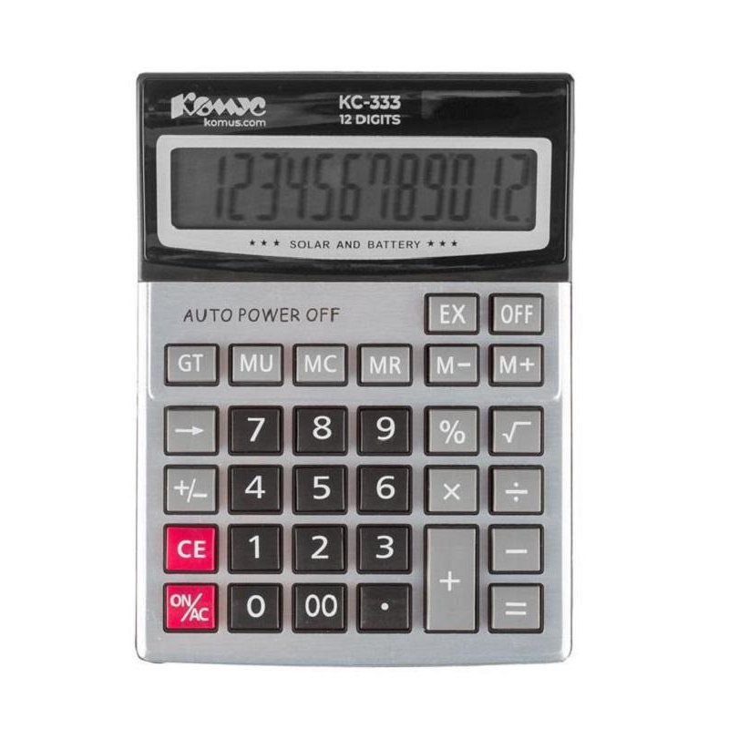 Настольный калькулятор KОМУС КС-333 . Большой дисплей с увеличенным углом обзора, устойчивый корпус и клавиатура с цветной дифференциацией для эффективной и комфортной работы. Калькулятор включает все основные функции: вычисления с процентами, незаменим для бухгалтеров благодаря наличию клавиш двойной памяти, '00' и MU для расчетов налогов и торговой наценки. Большой двенадцатиразрядный дисплей отображает большие значения с высокой точностью округления. Встроенный аккумулятор и солнечная батарея позволяют калькулятору работать при любом освещении. В калькуляторе имеется два источника питания: солнечная батарея и батарейка G10. Функция автоматического отключения (через 10 минут бездействия), что позволяет максимально продлить срок его службы без замены батареи. Размер: 170x125x38 мм. Тип клавиатуры: пластик. Наличие металлической панели: есть.