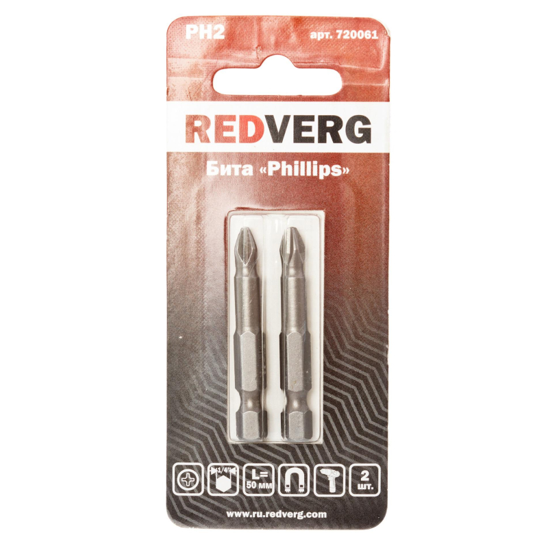 Бита Redverg PH2х50 (2 штуки) (720061) Phillips предназначена для для заворачивания/выворачивания шурупов и саморезов. Изготовлены из легированной инструментальной стали S2. Бита обладает магнитными свойствами, что позволяет удерживать саморез или шуруп в удобном положении.