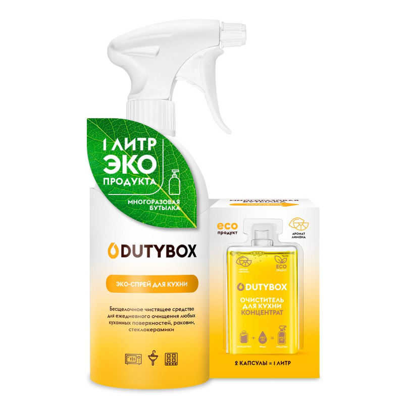 Чистящее средство для кухни DutyBox 50 мл (2 штуки в упаковке) Назначение: Чистящий спрей для уборки кухни Dutybox . Предназначен для очистки различных кухонных поверхностей и утвари: столешниц и мебели, бытовой техники, варочных панелей, раковин, кастрюль, сковород, противней. Средство для плит отлично справляется с ежедневной уборкой, удаляет жир (Антижир) и известковый налет, придает блеск поверхностям и полностью смывается водой. Нейтрализует неприятные запахи и обладает ароматизирующим эффектом. Эко средство для уборки кухни содержит мягкие чистящие вещества, не содержит щелочь, хлор, фосфаты, агрессивные ПАВ, SLS и SLES! Каждая капсула разбавляется на 500 мл готового продукта. Способ применения: отрежьте ножницами горлышко капсулы и смешайте ее содержимое с 450 мл воды, накрутите распылитель и перемешайте. Готовое средство нанесите на загрязненную поверхность, немного подождите( 5-10 мин при сильном загрязнении), потрите губкой и смойте водой. Меры предосторожности: При попадании в глаза может вызвать раздражение. При попадании в глаза - осторожно промыть водой в течение нескольких минут. При необходимости обратиться за медицинской помощью. Хранить в плотно закрытой упаковке, в недоступном для детей месте, отдельно от пищевых продуктов. Не смешивать с другими средствами бытовой химии. Состав: ?30% вода очищенная; ?5%, но