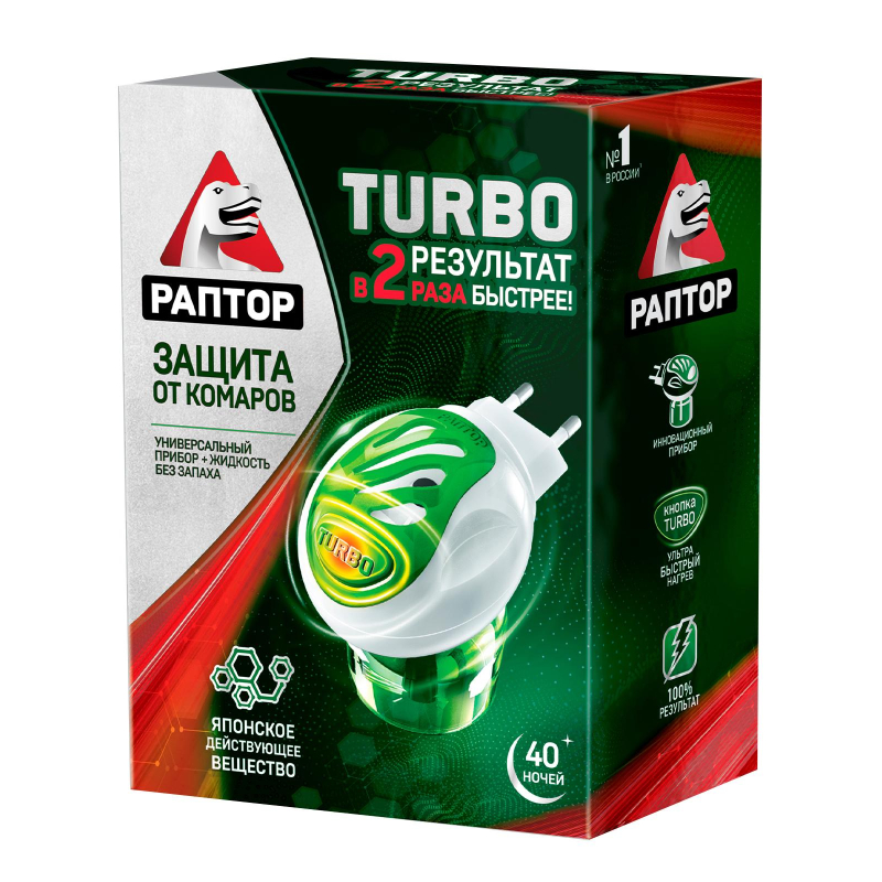 Средство от насекомых Раптор Комплект Turbo фумигатор+жидкость от комаров 35 мл. Назначение: Для защиты взрослых и детей с 2-х лет от нападения (уменьшения количества укусов) комаров. Способ применения: Поставить флакон с жидкостью в прибор. Принцип действия жидкости очень прост: при нагревании стержня флакончика от керамического нагревательного элемента прибора начинается медленное испарение действующего вещества. Испаряясь, оно постепенно заполняет пространство, оказывая свое воздействие на насекомых. При включении кнопки TURBO температура на керамическом элементе становится выше, что приводит к более интенсивному испарению жидкости из флакончика. Таким образом, требуемая концентрация действующего вещества в комнате достигается в 2 раза быстрее, чем при использовании обычного режима. Меры предосторожности: Используйте жидкость только по назначению. Средство применять в хорошо проветриваемых помещениях или при открытых форточках и окнах не более 8 часов при непрерывной работе прибора; в закрытых помещениях не более 2 часов в отсутствие людей с последующим проветриванием. Состав: Etoc (эток) - 1,3%, растворитель, стабилизатор. Срок годности: 5 лет с даты изготовления.