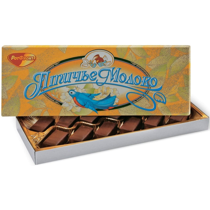 Конфеты "Птичье молоко" от фабрики "Рот Фронт" - нежное воздушное суфле, покрытое шоколадной глазурью и припудренное какао-порошком. Три утонченных вкуса: классическое сливочное суфле с нежными оттенками пломбира во вкусе, лимонное с насыщенным цитрусовым ароматом и шоколадное, с мягкими оттенками шоколадной пряности. Состав: шоколадная глазурь (сахар, какао тертое, эквивалент масла какао, какао-порошок, эмульгаторы: Е322, Е476, ароматизатор, идентичный натуральному "Ванильный"), сахар, патока, заменитель молочного жира (растительный), сгущенное с сахаром молоко, белок сухой яичный, желирующий агент - агар, регулятор кислотности - кислота лимонная, консервант - сорбат калия, спирт, ароматизаторы, идентичные натуральным: "Лимон", "Ваниль", "Масло-сливки", "Крем-шоколад", краситель Е102. Пищевая ценность на 100г продукта, г: белки 2,5; жиры 23; углеводы 56. Энергетическая ценность: 450 ккал. Вес: 160 г. Тип упаковки - картонная каробка. Страна происхождения - Россия. Срок годности 5 месяцев. Размер упаковки (ДxШxВ) - 26.8x10x2.2 см.
