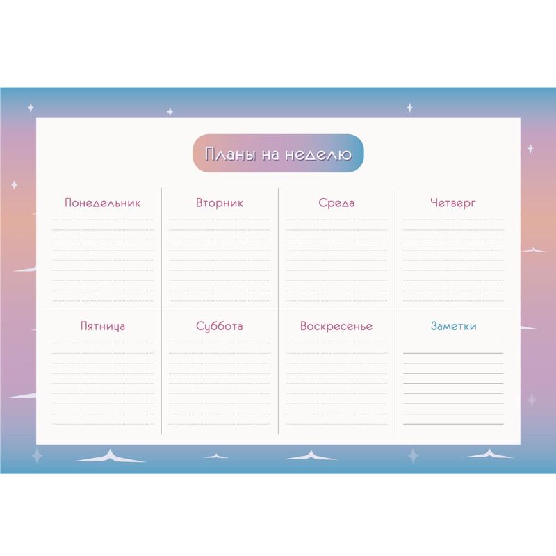 Планер настольный А4 формата недатированный. В планере 55 листов на склейке. Без верхней обложки. Подложка выполнена из переплетного картона, кашированного мелованной бумагой. Внутренний блок - офсетная бумага плотностью 80 г/кв.м. Планер предназначен для планирования своего дня, недели и месяца.