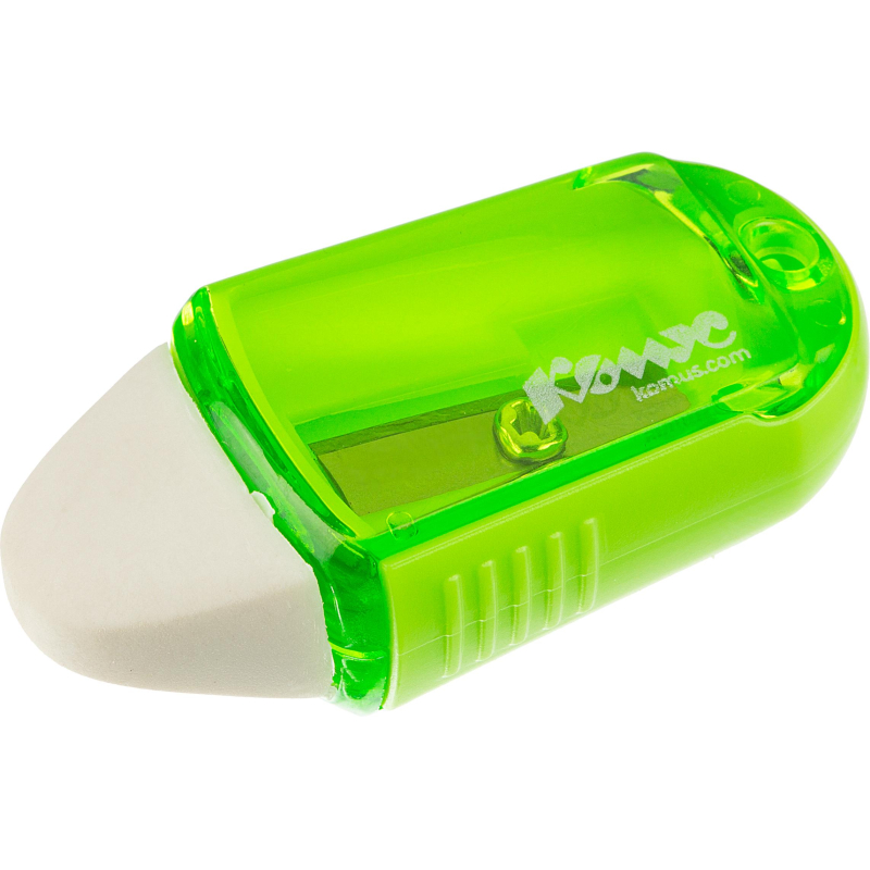 Ластик-точилка Комус выполнен в ярком пластиковом корпусе зеленого цвета, который вращается на 360°. Точилка для карандашей с одним отверстием имеет острое и прочное лезвие. Предназначена для заточки карандашей диаметром 8 мм. Ластик выполнен из термопластичного каучука, не содержит ПВХ. Подходит для удаления надписей, сделанных чернографитными карандашами. Размер изделия: 50х24х15 мм.