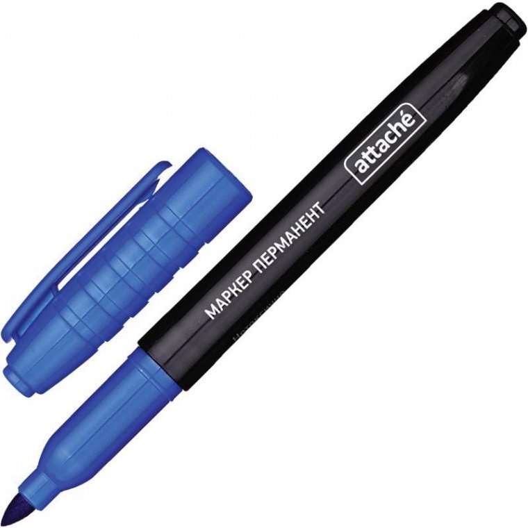 Перманентный маркер Attache в корпусе из прочного пластика. Нестираемые чернила пишут на любой поверхности. Круглый наконечник позволяет провести линию толщиной от 1,5 до 3 мм. Цвет — синий. Ресурс письма — линия около 180 м.