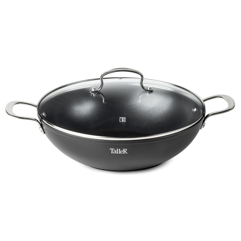 Сковорода ВОК TalleR алюминиевая с крышкой 30 см. Высококачественное многослойное антипригарное покрытие Whitford QuanTanium содержит уникальную смесь частиц титана, что обеспечивает покрытию необычайную стойкость к износу и царапинам, высокие антипригарные свойства этого покрытия позволяют готовить пищу с минимальным количеством масла. Антипригарное покрытие не содержит PFOA. Внешнее покрытие устойчиво к высоким температурам и загрязнениям и долго сохраняет превосходный внешний вид. Утолщенное дно 4.0 мм обеспечивает быстрый и равномерный нагрев и защищает от деформации при правильном использовании. Ручки из нержавеющей стали на клепочном креплении дают возможность надежно удерживать посуду во время использования. Подходит для использования на электрических, газовых, керамических, галогеновых плитах (кроме индукционных). Рекомендуется ручная мойка для сохранения свойств антипригарного покрытия (мойка в посудомоечной машине сокращает срок службы любой сковороды).