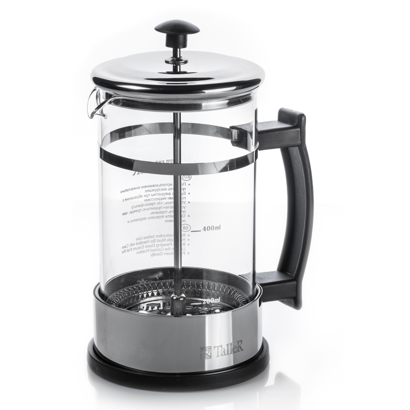 Френч-пресс TalleR 600 мл (TR-32300). Колба выполнена из боросиликатного стекла, устойчивого к перепадам температур. Корпус выполнен из высококачественной нержавеющей стали 18/10 (AISI 304) и безопасного пищевого пластика (РР). Пресс выполнен из высококачественной нержавеющей стали. Толщина колбы - 2 мм, толщина корпуса - 0,8 мм, толщина пресс-фильтра - 0,3 мм. Можно мыть в посудомоечной машине при температуре не выше 65 градусов. Для сохранения наилучшего внешнего вида френч-пресса рекомендуется ручная мойка.