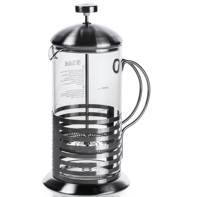 Френч-пресс TalleR 1 л (TR-32310). Колба выполнена из боросиликатного стекла, устойчивого к перепадам температур. Корпус выполнен из высококачественной нержавеющей стали 18/10 (AISI 304). Пресс выполнен из высококачественной нержавеющей стали. Толщина колбы - 2 мм, толщина корпуса - 0,8 мм, толщина пресс-фильтра - 0,3 мм. Можно мыть в посудомоечной машине при температуре не выше 65 градусов. Для сохранения наилучшего внешнего вида френч-пресса рекомендуется ручная мойка.