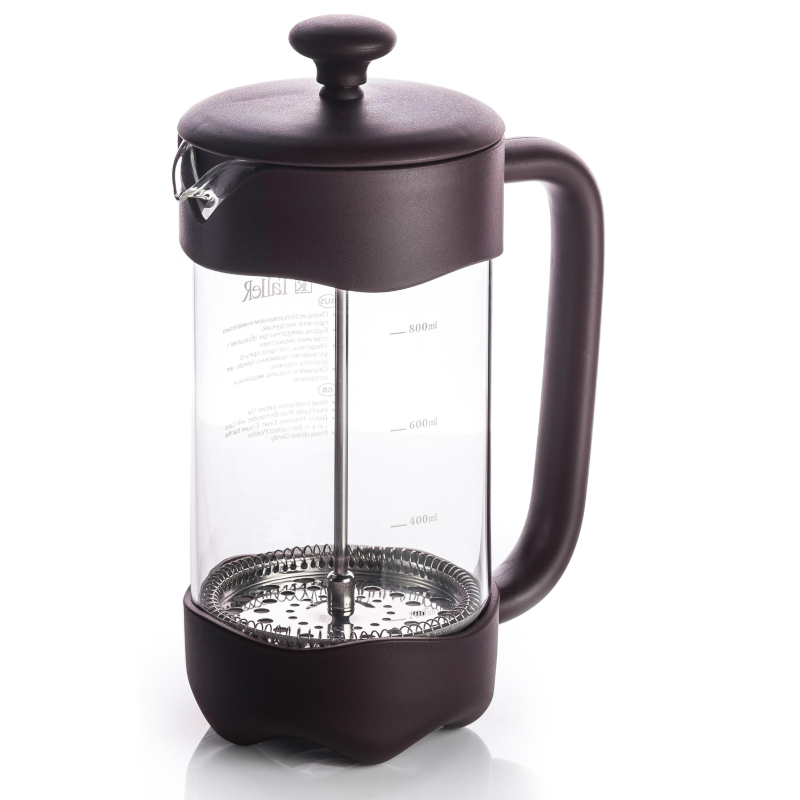 Френч-пресс TalleR 1 л (TR-32326). Колба выполнена из боросиликатного стекла, устойчивого к перепадам температур. Корпус выполнен из безопасного пищевого пластика (РР). Пресс выполнен из высококачественной нержавеющей стали. Толщина колбы - 2 мм, толщина пресс-фильтра - 0,3 мм. Можно мыть в посудомоечной машине при температуре не выше 65 градусов. Для сохранения наилучшего внешнего вида френч-пресса рекомендуется ручная мойка.