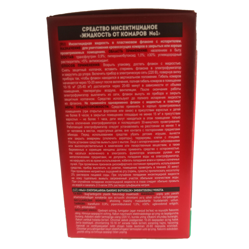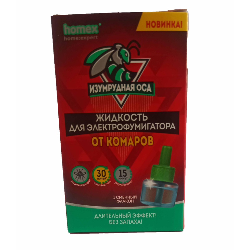 Средство от насекомых Изумрудная Оса жидкость 30 ночей 30 мл. Назначение: Для защиты взрослых и детей с 2-х лет от нападения (уменьшения количества укусов) комаров. Способ применения: Вскрыть упаковку, достать флакон с жидкостью. Отвинтить у флакона пластмассовую крышку, вставить стержень внутрь фумигатора и закрепить его до упора. Включить электрофумигатор в электросеть (220 В, 50 Гц), повернуть вилку прибора так, чтобы флакон располагался вертикально, Полная гибель комаров наступает через 20 - 30 мин, Флакон объемом 30 мл рассчитан на 30 ночей по 8 часов работы ежедневно в помещения 15 ?20 м? (30-50 м?). Меры предосторожности: Средство применять в присутствии людей в хорошо проветриваемых помещениях (при открытых форточках или окнах) не более 8 часов; в закрытых помещениях площадью не менее 15 м? не более 1 часа. Устанавливать электрофумигатор не ближе 1 м от человека. Не трогать включенный прибор влажными руками и металлическими предметами. Средство рекомендуется, применять с осторожностью в присутствии людей, которые страдают аллергическими заболеваниями или имеют повышенную чувствительность к лекарственным препаратам. При случайном попадании жидкости в глаза и на кожу обильно промыть водой! Хранить отдельно от пищевых продуктов и лекарственных средов, в местах, недоступных для детей и домашних животных, в прохладном, сухом, защищенном от света месте при температуре от минус 15°С до плюс 30°С. Использовать только по назначению! Утилизируется как бытовые иходы. Состав: циперметрин (0,2%), тетраметрин (0,15%), синергист, отдушка, углеводородный пропеллент, растворитель. Срок годности: 3 года с даты изготовления.