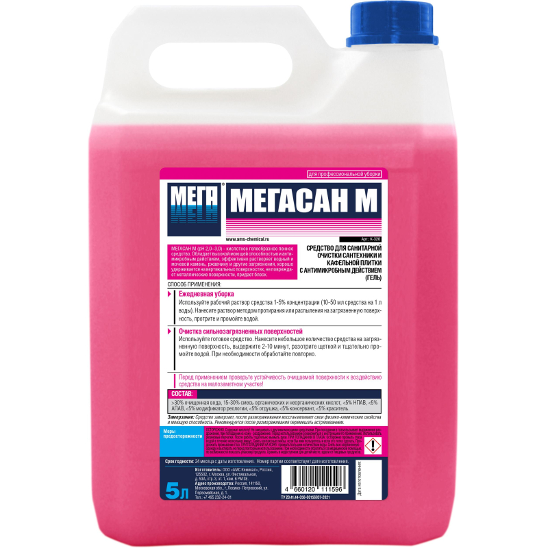 Средство для санитарной очистки сантехники с антимикробным эффектом "Мега Мегасан М" 5 л (концентрат). Назначение: средство кислотное гелеобразное пенное для очистки от водного и мочевого камня, ржавчины, масложировых и других загрязнений. Рекомендуется применять для мойки сантехники, туалетных и ванных комнат, душевых, бассейнов. Средство обладает высокой моющей способностью и антимикробным действием, устраняет неприятные запахи. Хорошо удерживается на вертикальных поверхностях, не повреждает металлы, придает блеск. Рекомендуется применять в сфере профессионального клининга, на предприятиях пищевой и иных отраслей промышленности, в сфере общественного питания, в учебных, детских, дошкольных, школьных и медицинских учреждениях, гостинично-ресторанных, спортивных, развлекательных и торговых комплексах, на транспортных и ремонтных предприятиях, в общественных и административных зданиях, в быту. Способ применения: Перед применением проверьте устойчивость очищаемой поверхности к воздействию средства на малозаметном участке! - ежедневная уборка: Используйте рабочий раствор средства 1-5% концентрации (10-50 мл средства на 1 л воды). Нанесите раствор методом протирания или распыления на загрязненную поверхность, протрите и промойте водой. - очистка сильнозагрязненных поверхностей: Используйте готовое средство. Нанесите небольшое количество средства на загрязненную поверхность, выдержите 2-10 минут, разотрите щеткой и тщательно промойте водой. При необходимости обработайте повторно. Состав: >30% очищенная вода, 15-30% смесь органических и неорганических кислот,