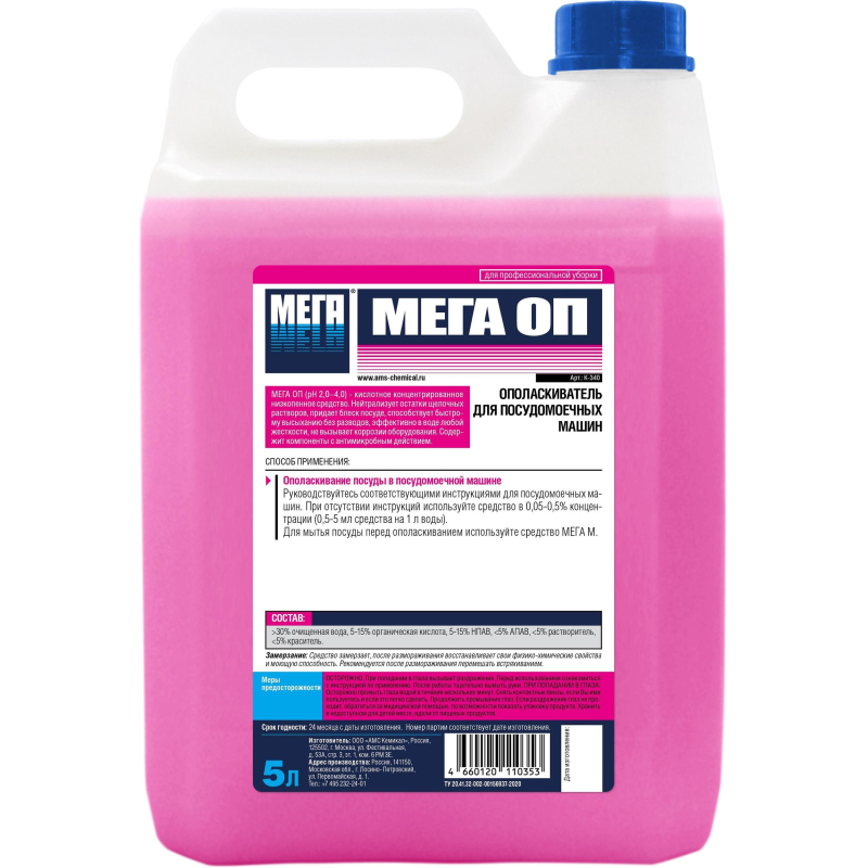 Ополаскиватель посуды в посудомоечных машинах "Мега ОП" 5 л (концентрат). Назначение: средство для ополаскивания всех видов посуды в посудомоечных и ополаскивающих машинах всех типов. Средство нейтрализует остатки щелочных растворов, придает блеск посуде, способствует ее быстрому высыханию без подтеков и разводов. Эффективно в воде любой жесткости, не вызывает коррозии оборудования. Содержит компоненты c антимикробным действием. Рекомендуется применять в сфере профессионального клининга, на предприятиях пищевой и иных отраслей промышленности, в сфере общественного питания, в учебных, детских, дошкольных, школьных и медицинских учреждениях, гостинично-ресторанных, спортивных, развлекательных и торговых комплексах, на транспортных и производственных предприятиях, в общественных и административных зданиях, в быту. Способ применения: Руководствуйтесь соответствующими инструкциями для посудомоечных машин. При отсутствии инструкций используйте средство в 0.05-0,5% концентрации (0.5-5 мл средства на 1 л воды). Состав: >30% очищенная вода, 5-15% органическая кислота, 5-15% НПАВ,