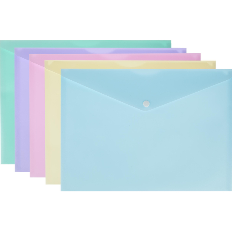 Папка-конверт формата А4 изготовлена из пластика плотностью 180 мкм. Закрывается на кнопку. Вмещает до 120 листов. Удобна для хранения и переноски документов, предотвращает их смятие и загрязнение. Размер папки - 340x240 мм. Поставляются упаковками по 5 штук . Цвета папок в упаковке - сиреневый, желтый, голубой, бирюзовый, розовый.