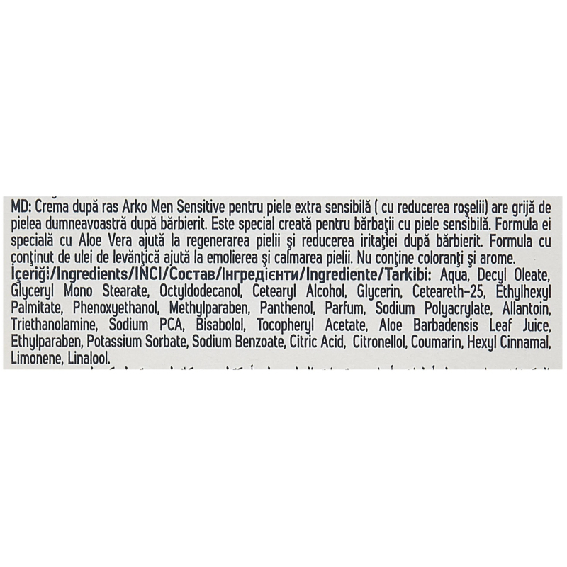 Крем после бритья ARKO Men для Чувствительной кожи заботится о вашей коже после бритья. Специально разработанная формула для чувствительной мужской кожи. Формула с Алоэ Вера защищает чувствительную кожу и уменьшает риск раздражения, вызванного бритьем. А входящее в состав масло лаванды увлажняет и смягчает кожу. Состав: aqua, decyl oleate, glyceryl stearate, octyldodecanol, cetearyl alcohol, glycerin, ceteareth-25, ethylhexyl palmitate, sodium polyacrylate, allantoin, aloe barbadensis leaf juice, sodium pca, tocopheryl acetate, phenoxyethanol, methylparaben, ethylparaben, potassium chloride, sodium benzoate, triethanolamine, geraniol, linalool, limonene. Объем: 50 г.