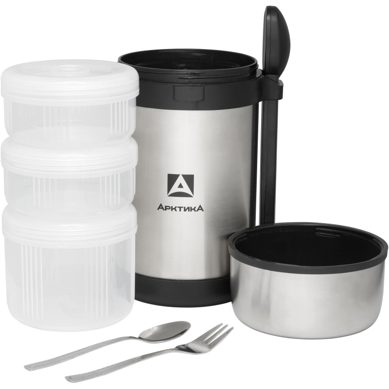 Термос Арктика 1.5 л серебристый с контейнерами. Оптимальное решение для переноски комплексного обеда из нескольких блюд. Если вам нужно взять с собой суп, второе блюдо и салат, то нет нужды брать несколько емкостей - один термос серии 403 заменит три. В комплект входят 3 надежно закрывающихся контейнера разных объемов (300, 300 и 600 мл), столовые приборы, вместительная крышка-тарелка и ремень для переноски на плече. Сохраняет тепло или холод 6 часов. Термос выполнен из долговечной пищевой нержавеющей стали, крышка термоса обеспечивает 100% герметичности. Контейнеры подходят для использования в микроволновой печи: можно положить еду холодной и хранить в термосе до момента разогрева, не боясь, что она испортится. Обратите внимание, что термос можно использовать только вместе с контейнерами. Гарантия на вакуум - 5 лет. Объем термоса: 1500 мл; Время сохранения тепла: до 6 часов; Время сохранения холода: до 6 часов.