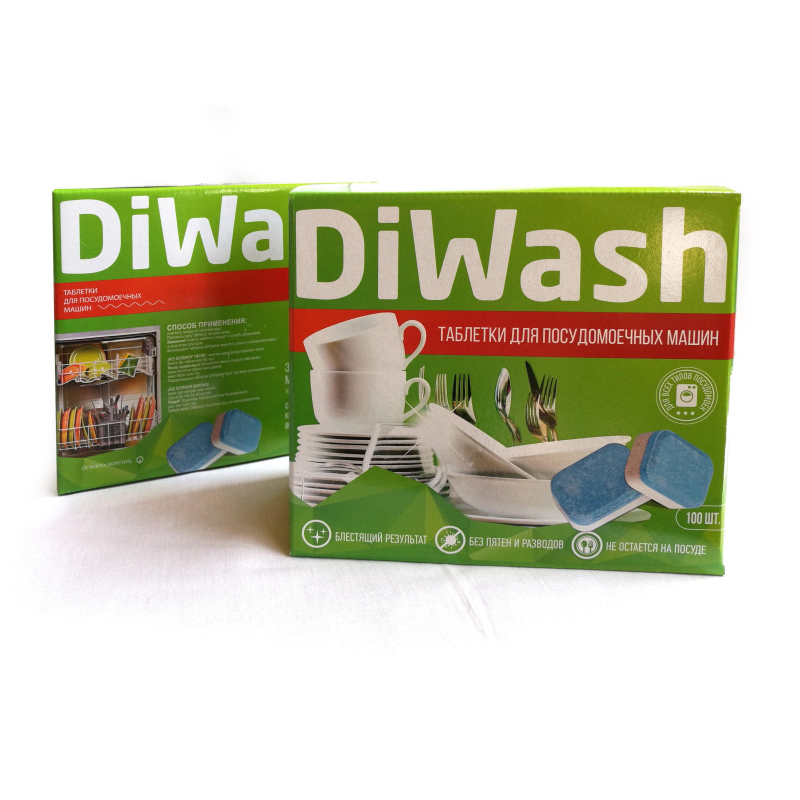 Таблетки для посудомоечных машин DiWash 100 штук в упаковке. Назначение: для мытья посуды. Способ применения: очистить посуду от остатков еды. Положить одну таблетку на одну мойку. Внимание! Класть таблетку следует в отсек с дозировкой, а не в отсек для соли. Используйте таблетки DiWasher вместе с солью и ополаскивателем. Следуйте рекомендациям по мойке в инструкции для посудомоечной машины. Меры предосторожности: избегать попадания в глаза, может вызвать раздражение. При попадании в глаза немедленно промыть большим количеством воды и обратиться к врачу. При проглатывании также немедленно обратиться к врачу и показать упаковку. Может вызвать аллергические реакции. Хранить в плотно закрытых упаковках в сухом помещении. Защищать от нагревания, влаги, попадания прямых солнечных лучей. Беречь от детей. Хранить вдали от пищевых продуктов. Не употреблять в пищу. Состав: менее 5% кислородосодержащий отбеливатель; активатор TAED; менее 5% неионогенные ПАВ; фосфаты 5-15%; фосфонаты; силикаты; энзимы; поликарбоксилаты; ароматизатор; лимонен. Срок годности: 2 года.