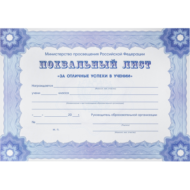 Похвальный лист "За отличные успехи в учении" выполнен в фиолетово-синих тонах. Предназначен для школьников, закончивших учебный год, с отличием. Изготовлен из мелованного картона плотностью 250 г/кв.м. Формат - А4. Для печати на принтере необходимо установить режим "Плотная бумага". Поставляется упаковками по 10 штук.