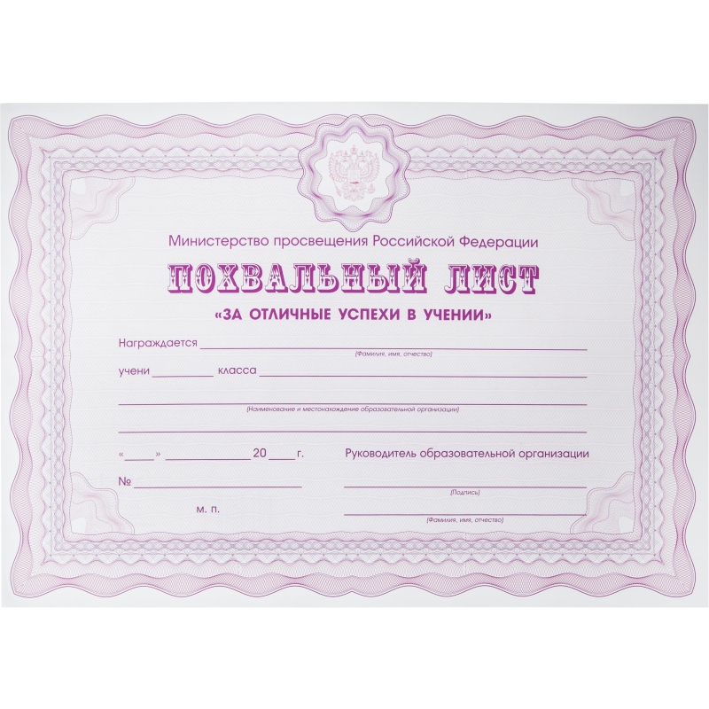 Похвальный лист "За отличные успехи в учении" выполнен в фиолетовых тонах. Предназначен для школьников, закончивших учебный год, с отличием. Изготовлен из мелованного картона плотностью 250 г/кв.м. Формат - А4. Для печати на принтере необходимо установить режим "Плотная бумага". Поставляется упаковками по 10 штук.