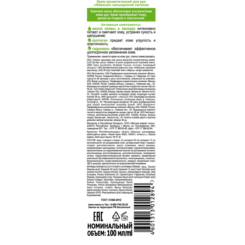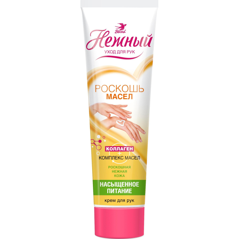 Крем для рук Весна Нежный Роскошь масел питательный, 100 мл. Обеспечивает ультрапитание кожи рук, преображает кожу, делая ее гладкой и эластичной, интенсивно питает и смягчает, обеспечивает эффективное долгосрочное увлажнение, устраняет сухость и шелушение. Способ применения: легкими массажными движениями нанести небольшое количество крема на сухую чистую кожу рук. Состав: эластан 5%, вода 5%, пропиленгликоль 5%, циклопентасилоксан 5%, цетеариловый спирт 5%, этилгексил стеарат 5%, бензиловый спирт 5%, каприновый триглицерид 5%, глицерина стеарат 5%, парфюмерная композиция 5%, полиакрилат натрия 5%, эдта 5%, растворимый коллаген 5%, стеарат 5%, масло оливковое 5%, масло авокадо 5%, гидроксиэтилмочевина 5%, Масло органы 5%, моноглицериды дистиллированные 5%, гидроксипропилированный фосфат крахмала 5%.