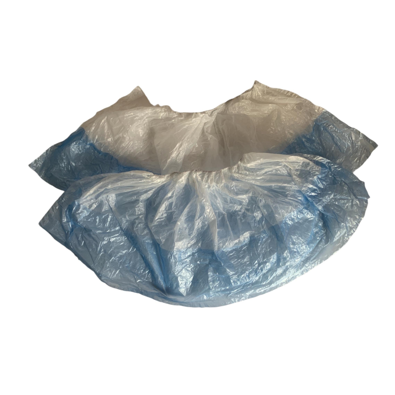 Бахилы медицинские одноразовые нестерильные бело-синие с двойной подошвой с одной резинкой. Применяются в гигиенических целях для сохранения чистоты помещений от уличной грязи. Используются в медицинских учреждениях, в помещениях особо чистых производств, в музеях, фитнесс центрах, школах и т.д. Материал бахил - полиэтилен низкого давления (первичное сырье). Толщина пленки в один слой 7+7 мкм, вес одной пары 2,6 г. Упакованы в полиэтиленовый пакет по 100 пар.