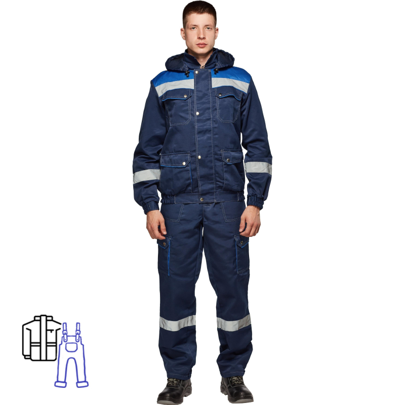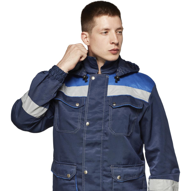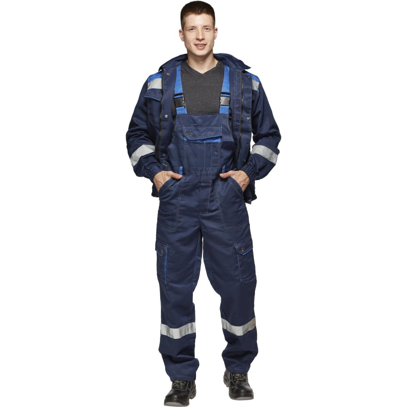 Костюм рабочий летний мужской синий/васильковый. Состав ткани: 80% полиэстер, 20% хлопок. Плотность ткани: 200 +/- 10 г/кв.м. Верхние накладные карманы с фигурными клапанами и перекантом на кнопках. Нижние карманы с полуобъемом, с фигурными клапанами и перекантом на кнопках. Укороченная куртка на поясе с частичной стяжкой на эластичной резинке. Съемный капюшон на пуговицах с регулировкой объема по лицевой части. Полукомбинезон с многофункциональными карманами. Эластичная резинка по талии спинки. В костюме используется светоотражающая полоса 50 мм. Размер: 52-54. Рост: 182-188.