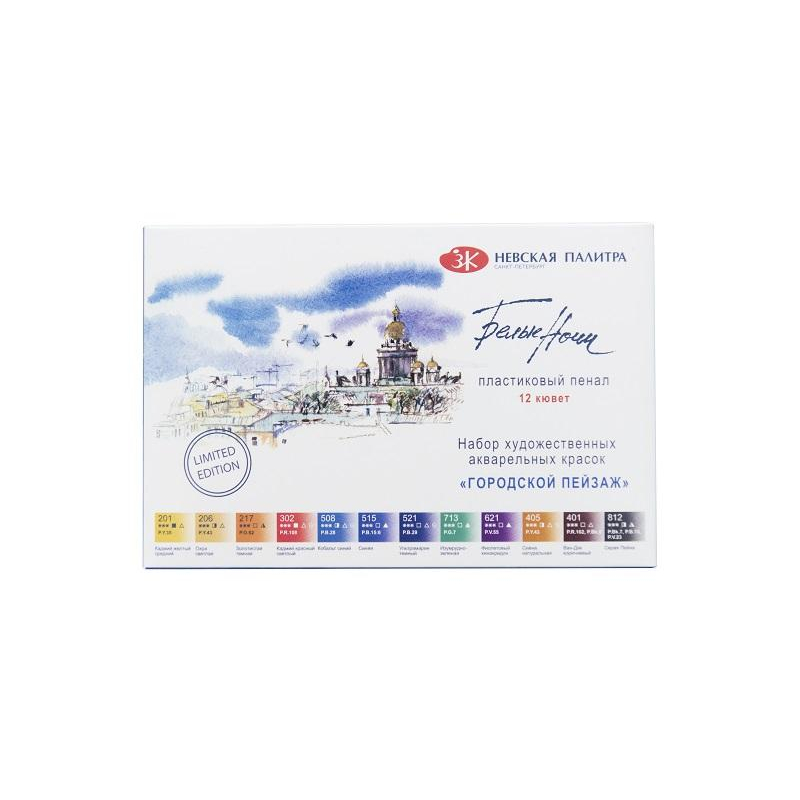 Профессиональные художественные сухие акварельные краски "Белые ночи" представляют собой тонкодисперсные суспензии пигментов и наполнителей в связующем, в состав которого входит водный раствор растительного клея - гуммиарабика. Все акварельные краски в палитре "Белые ночи" безопасны, сертифицированы и соответствуют стандартам ASTM D-4236. Высокая концентрация пигмента обеспечивают максимальную интенсивность цветового тона акварели. Насыщенность сохраняется даже при разбавлении большим количеством воды. Отличаются прозрачностью, что дает возможность художнику работать тонкими лессировками. Чистые цвета позволяют писать в смесях и получать богатое многообразие оттенков. Основная часть красок обладает высочайшим показателем светостойкости, что способствует сохранности работ свыше 100 лет. Все это обеспечивает их высокое качество и возможность использования в ответственных работах. Тематический набор профессиональной акварели "Городской пейзаж" разработан для создания пейзажей городской среды и архитектурных скетчей. Температура транспортирования/хранения: не нормируется/не ниже 0 С. Гарантийный срок - 5 лет с даты изготовления набора. Набор в картоном чехле и пластиковом пенале на 12 цветов. Объем краски в одной кювете 2.5 см3. Кисточка в комплект не входит. Размер упаковки: 325x420x175 мм. Состав набора: кадмий желтый средний, охра светлая, золотистая темная, охра красная, кадмий красный светлый, кобальт синий, синяя, ультрамарин темный, изумрудно-зеленая, фиолетовый хинакридон, Ван-Дик коричневый, серая Пейна.