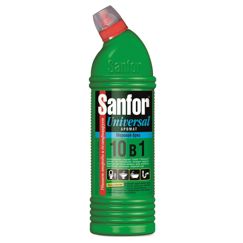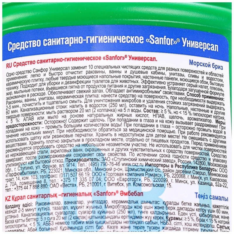 Средство для сантехники Sanfor универсал морской бриз 1 л. Назначение: Одно средство Санфор Универсал заменит 10 специальных чистящих средств для разных поверхностей и областей применения: легко и быстро очистит раковины, ванны и душевые кабины, унитазы, сливы и водостоки, керамическую плитку, любые твердые моющиеся напольные покрытия, настенные панели, моющиеся обои, бытовую технику. Подходит для уборки туалетов для животных. Эффективно устраняет серый налет, плесень, жир, мыльные потеки, въевшиеся пятна от продуктов питания и другие загрязнения. Благодаря загущенной формуле экономичен в расходе. Обеспечивает свежий запах. Обладает антимикробными свойствами. Способ применения: Раковины, ванны, унитазы, керамическая плитка: нанести средство на поверхность, при необходимости выдержать 2-5 минут, почистить и тщательно смыть. Для уничтожения микробов и удаления стойких загрязнений - выдержать 30 минут и смыть водой. Канализационные стоки: налить средство в водосток (250 мл), оставить на ночь. Напольные, настенные, акриловые и другие твердые моющиеся поверхности: мыть раствором 20 мл (2 колпачка) средства на 5 л воды. Меры предосторожности: Опасно. При попадании в глаза может вызвать необратимые последствия. При попадании на кожу вызывает раздражение. Чрезвычайно токсично для водных организмов. Использовать резиновые перчатки или щетку. При попадании на кожу - промыть большим количеством воды. При попадании в глаза - осторожно промыть водой в течение нескольких минут. При необходимости обратиться за медицинской помощью. Не смешивать с другими средствами бытовой химии. Перед применением опробовать средство на небольшом незаметном участке. Не использовать средство без разбавления для чистки поверхностей из нержавеющей стали, акриловых ванн, окрашенных и других, чувствительных к средству поверхностей. Состав: 5 %, но 15 % гипохлорит натрия, 5 %: АПАВ или мыло на основе натуральных жирных кислот, НПАВ, щелочь, ароматизирующий компонент. Условия хранения: Хранить плотно закрытым в прохладном, недоступном для детей месте, отдельно от пищевых продуктов. Средство замерзает, после размораживания сохраняет свои свойства. Средство и упаковку утилизировать как бытовой отход. Срок годности: 2 года.