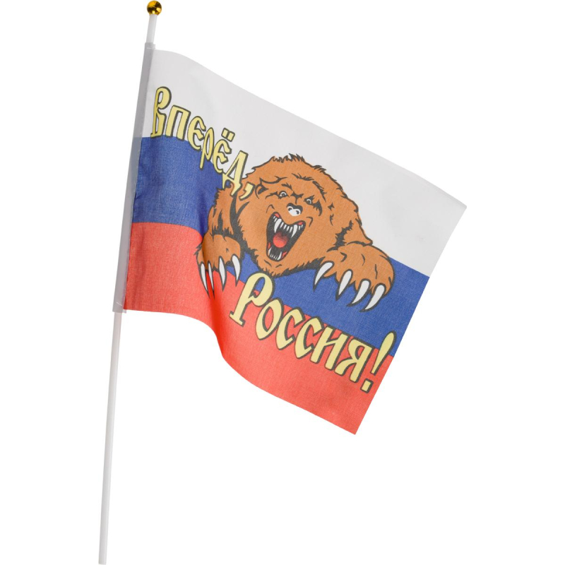 Флаг России с медведем олицетворяет силу, мужество, жизнестойкость нашего народа. Этот зверь считается самым крупным и опасным во многих европейских странах. Флаги России с таким оригинальным дизайнерским решением нередко заказывают болельщики спортивных команд, военнослужащие. Размер полотна флага 16х24 см, также имеется пластиковый флагшток длиной 40 см.