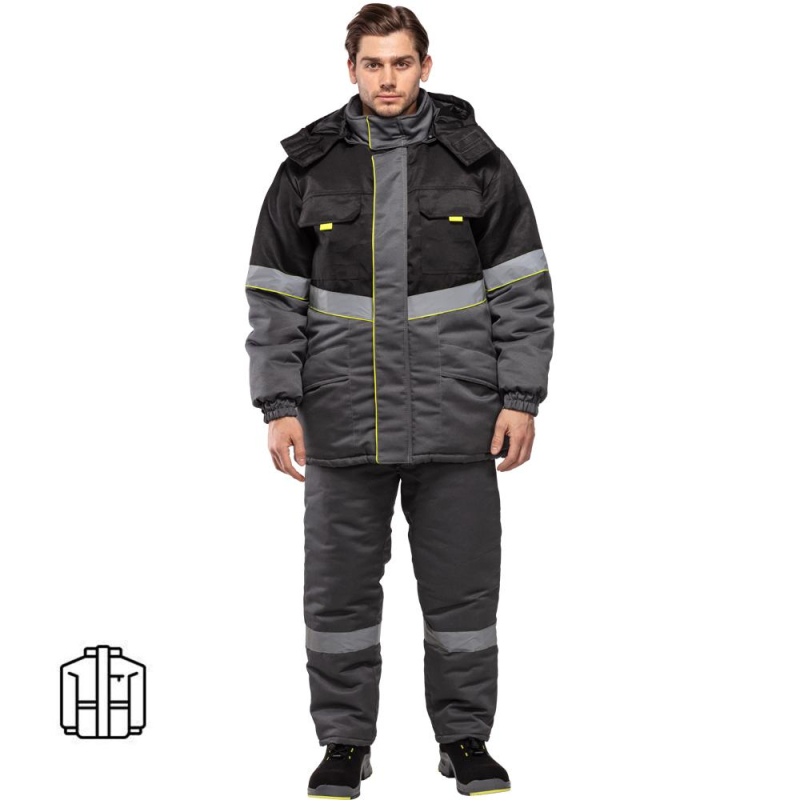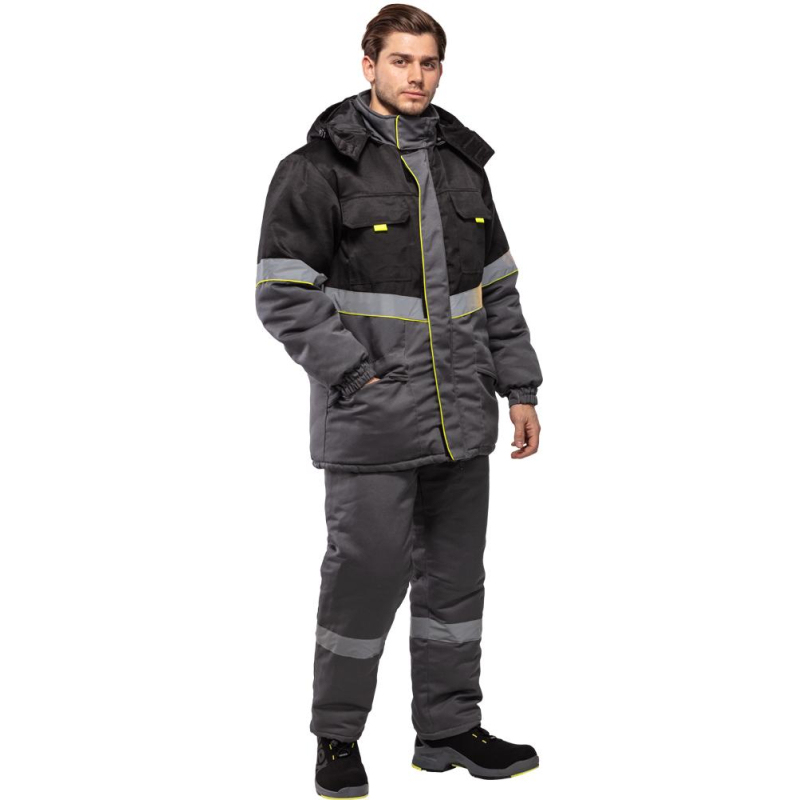Куртка рабочая зимняя мужская з43-КУ с СОП (размер 56-58, рост 182-188). Состав ткани: смесовая (65% полиэстер, 35% хлопок). Плотность: 210 г/кв.м. Куртка прямого силуэта, комбинированная, с притачной утепляющей подкладкой (синтепон - плотностью 450 г/м2 (основа) и 300 г/кв.м (руки)), с центральной застежкой на двухзамковую тесьму-молнию, с планкой из флиса под молнию в верхней части правой полочки. Технология изготовления термоскрепленного синтепона (евросинтепона) позволяет использовать данный утеплитель для создания более тонких изделий с сохранением термозащитных свойств. Важными преимуществами утеплителя являются легкость и хорошая пластичность, что улучшает подвижность в костюме. А также исключение миграции волокна через ткани верха и подкладки за счет скрепления слоев. Планка огибает верхний край молнии во избежание соприкосновения ее с лицом, с ветрозащитным клапаном, фиксирующимся на контактную ленту в 4-х точках. Ветрозащитный клапан состоит из 2-х частей - одна из них клапан куртки, другая - пата воротника, с воротником-стойка, со съемным утепленным капюшоном (верх синтепон подклад), с втачными рукавами. Ветрозащитный клапан с кантом. Имеется водоотталкивающая пропитка. Полочки состоят из кокетки, средней части и нижней части. На средней части расположены накладные карманы с утепленными клапанами, фиксирующимися на контактную ленту. Углы клапанов имеют скошенную форму, для удобства пользования предусмотрены флажки-держатели из отделочной ткани лимонного цвета. Нижние части полочек с накладными карманами на подкладке, с утепленными клапанами. Одна сторона нижних карманов и клапанов входит в продольные рельефные швы нижних частей полочек, другая сторона карманов и клапанов входит в боковые швы. Спинка с кокеткой, центральной и нижней частью. Рукава втачные с поперечным членением выше линии локтя. Низ рукавов с манжетами, частично стянутыми эластичной тесьмой. С внутренними трикотажными напульсниками. Воротник-стойка, утепленный, с планкой и тесьмой-молнией для пристегивания капюшона. Внутренняя деталь воротника из флиса. Съемный утепленный капюшон с цельновыкроенной подбородочной частью, фиксирующейся на липучку. По лицевому срезу проходит кулиса со шляпной резинкой, выведенной через 2 пары люве##сов с фиксаторами. На затылочной части затяжник. Фиксируется на липучку. Кокетки, средник части полочек, нагрудные карманы с клапанами, кокетки и средние части спинки, верхние части рукавов и капюшон. Вверх от шва притачивания средней части полочек, спинки, верхней части рукавов настрачивается СОП (шириной 5 см) с образованием канта шириной 3 мм лимонного цвета. На левой полочке подкладки н##строчен кар##ан, фиксируется на липучку (5 см). В нижней части внутреннего кармана настрочена лента Ф.И.О. Низ куртки подшивается швом вподгибку, образуя кулису, через которую проходит шляпная резинка, выведенная через 2 пары люверсов в области боковых швов и петельки в боковых швах подкладки. Регулируется фиксаторами. В боковой шов вставлен рем. Комплект с запасной пуговицей и составником. В шов горловины вставлена петля/вешалка из основной ткани с размерником. Нитки в тон ткани. Двойная отделочная строчка: по кокеткам полочек и спинки, по нагрудным клапанам, по нижним клапанам куртки. Двойной строчкой настрочены нагрудные карманы куртки. Сферы при