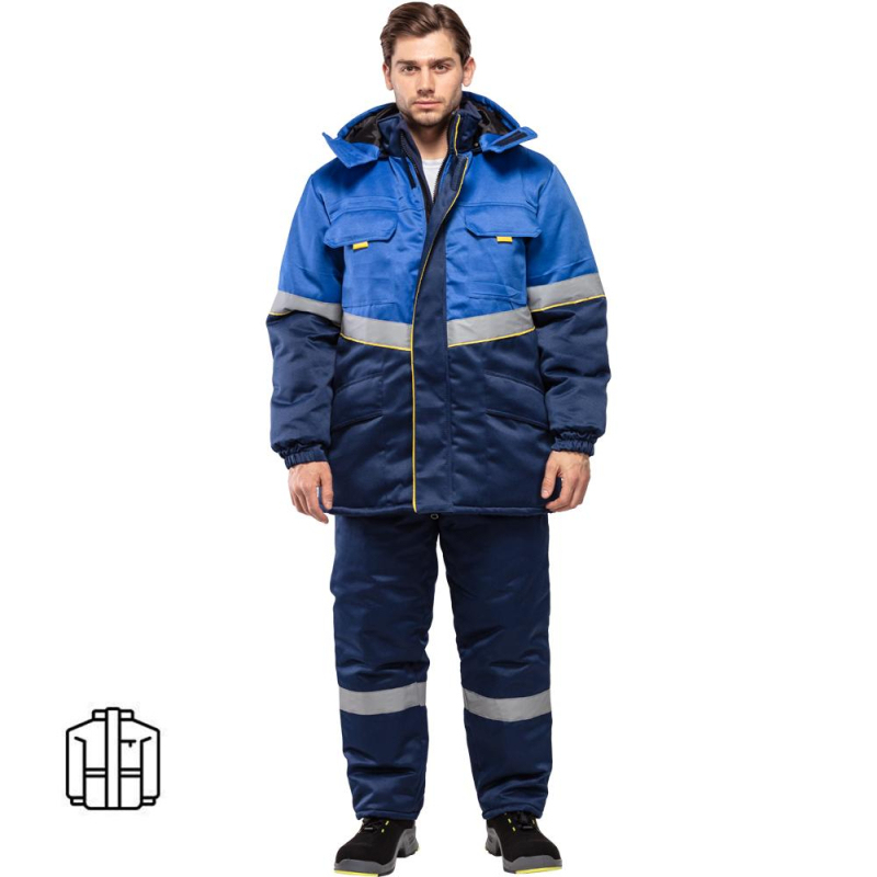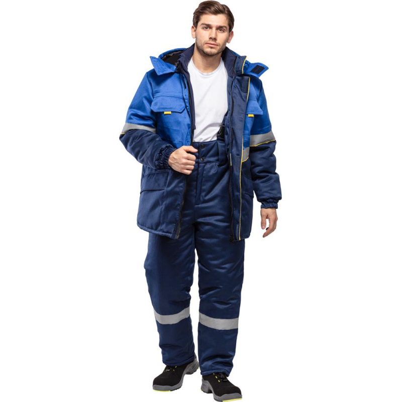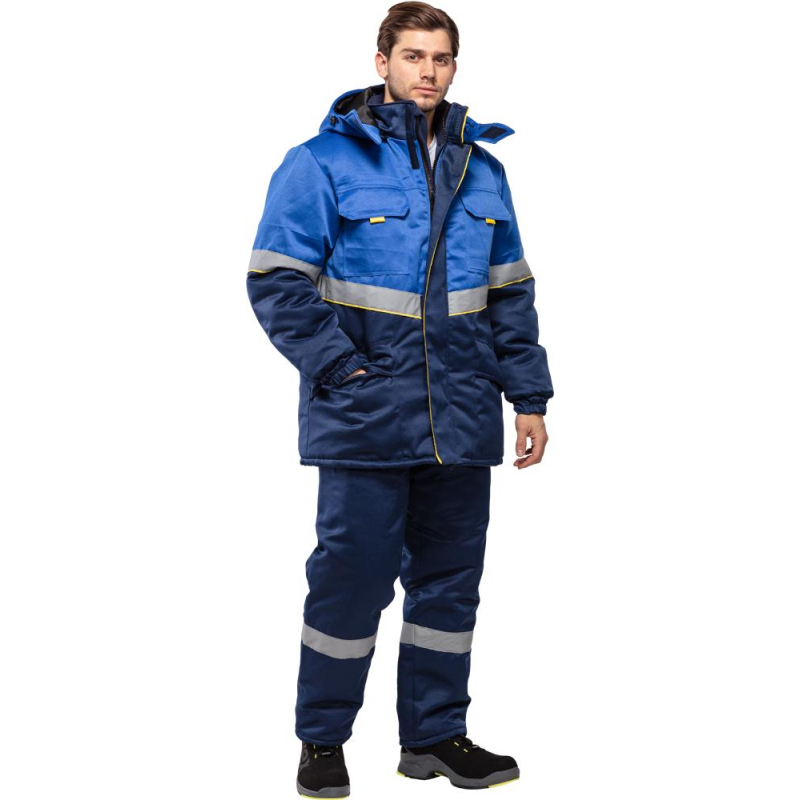 Куртка рабочая зимняя мужская з43-КУ с СОП (размер 44-46, рост 170-176). Состав ткани: смесовая (65% полиэстер, 35% хлопок). Плотность: 210 г/кв.м. Куртка прямого силуэта, комбинированная, с притачной утепляющей подкладкой (синтепон - плотностью 450 г/м2 (основа) и 300 г/кв.м (руки)), с центральной застежкой на двухзамковую тесьму-молнию, с планкой из флиса под молнию в верхней части правой полочки. Технология изготовления термоскрепленного синтепона (евросинтепона) позволяет использовать данный утеплитель для создания более тонких изделий с сохранением термозащитных свойств. Важными преимуществами утеплителя являются легкость и хорошая пластичность, что улучшает подвижность в костюме. А также исключение миграции волокна через ткани верха и подкладки за счет скрепления слоев. Планка огибает верхний край молнии во избежание соприкосновения ее с лицом, с ветрозащитным клапаном, фиксирующимся на контактную ленту в 4-х точках. Ветрозащитный клапан состоит из 2-х частей - одна из них клапан куртки, другая - пата воротника, с воротником-стойка, со съемным утепленным капюшоном (верх синтепон подклад), с втачными рукавами. Ветрозащитный клапан с кантом. Имеется водоотталкивающая пропитка. Полочки состоят из кокетки, средней части и нижней части. На средней части расположены накладные карманы с утепленными клапанами, фиксирующимися на контактную ленту. Углы клапанов имеют скошенную форму, для удобства пользования предусмотрены флажки-держатели из отделочной ткани лимонного цвета. Нижние части полочек с накладными карманами на подкладке, с утепленными клапанами. Одна сторона нижних карманов и клапанов входит в продольные рельефные швы нижних частей полочек, другая сторона карманов и клапанов входит в боковые швы. Спинка с кокеткой, центральной и нижней частью. Рукава втачные с поперечным членением выше линии локтя. Низ рукавов с манжетами, частично стянутыми эластичной тесьмой. С внутренними трикотажными напульсниками. Воротник-стойка, утепленный, с планкой и тесьмой-молнией для пристегивания капюшона. Внутренняя деталь воротника из флиса. Съемный утепленный капюшон с цельновыкроенной подбородочной частью, фиксирующейся на липучку. По лицевому срезу проходит кулиса со шляпной резинкой, выведенной через 2 пары люверсов с фиксаторами. На затылочной части затяжник. Фиксируется на липучку. Кокетки, средник части полочек, нагрудные карманы с клапанами, кокетки и средние части спинки, верхние части рукавов и капюшон. Вверх от шва притачивания средней части полочек, спинки, верхней части рукавов настрачивается СОП (шириной 5 см) с образованием канта шириной 3 мм лимонного цвета. На левой полочке подкладки настрочен карман, фиксируется на липучку (5 см). В нижней части внутреннего кармана настрочена лента Ф.И.О. Низ куртки подшивается швом вподгибку, образуя кулису, через которую проходит шляпная резинка, выведенная через 2 пары люверсов в области боковых швов и петельки в боковых швах подкладки. Регулируется фиксаторами. В боковой шов вставлен рем. Комплект с запасной пуговицей и составником. В шов горловины вставлена петля/вешалка из основной ткани с размерником. Нитки в тон ткани. Двойная отделочная строчка: по кокеткам полочек и спинки, по нагрудным клапанам, по нижним клапанам куртки. Двойной строчкой настрочены нагрудные карманы куртки. Сферы при