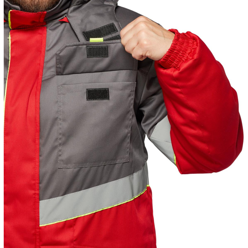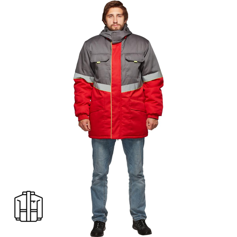 Куртка рабочая зимняя мужская з43-КУ с СОП (размер 44-46, рост 182-188). Состав ткани: смесовая (65% полиэстер, 35% хлопок). Плотность: 210 г/кв.м. Куртка прямого силуэта, комбинированная, с притачной утепляющей подкладкой (синтепон - плотностью 450 г/м2 (основа) и 300 г/кв.м (руки)), с центральной застежкой на двухзамковую тесьму-молнию, с планкой из флиса под молнию в верхней части правой полочки. Технология изготовления термоскрепленного синтепона (евросинтепона) позволяет использовать данный утеплитель для создания более тонких изделий с сохранением термозащитных свойств. Важными преимуществами утеплителя являются легкость и хорошая пластичность, что улучшает подвижность в костюме. А также исключение миграции волокна через ткани верха и подкладки за счет скрепления слоев. Планка огибает верхний край молнии во избежание соприкосновения ее с лицом, с ветрозащитным клапаном, фиксирующимся на контактную ленту в 4-х точках. Ветрозащитный клапан состоит из 2-х частей - одна из них клапан куртки, другая - пата воротника, с воротником-стойка, со съемным утепленным капюшоном (верх синтепон подклад), с втачными рукавами. Ветрозащитный клапан с кантом. Имеется водоотталкивающая пропитка. Полочки состоят из кокетки, средней части и нижней части. На средней части расположены накладные карманы с утепленными клапанами, фиксирующимися на контактную ленту. Углы клапанов имеют скошенную форму, для удобства пользования предусмотрены флажки-держатели из отделочной ткани лимонного цвета. Нижние части полочек с накладными карманами на подкладке, с утепленными клапанами. Одна сторона нижних карманов и клапанов входит в продольные рельефные швы нижних частей полочек, другая сторона карманов и клапанов входит в боковые швы. Спинка с кокеткой, центральной и нижней частью. Рукава втачные с поперечным членением выше линии локтя. Низ рукавов с манжетами, частично стянутыми эластичной тесьмой. С внутренними трикотажными напульсниками. Воротник-стойка, утепленный, с планкой и тесьмой-молнией для пристегивания капюшона. Внутренняя деталь воротника из флиса. Съемный утепленный капюшон с цельновыкроенной подбородочной частью, фиксирующейся на липучку. По лицевому срезу проходит кулиса со шляпной резинкой, выведенной через 2 пары люверсов с фиксаторами. На затылочной части затяжник. Фиксируется на липучку. Кокетки, средник части полочек, нагрудные карманы с клапанами, кокетки и средние части спинки, верхние части рукавов и капюшон. Вверх от шва притачивания средней части полочек, спинки, верхней части рукавов настрачивается СОП (шириной 5 см) с образованием канта шириной 3 мм лимонного цвета. На левой полочке подкладки настрочен карман, фиксируется на липучку (5 см). В нижней части внутреннего кармана настрочена лента Ф.И.О. Низ куртки подшивается швом вподгибку, образуя кулису, через которую проходит шляпная резинка, выведенная через 2 пары люверсов в области боковых швов и петельки в боковых швах подкладки. Регулируется фиксаторами. В боковой шов вставлен рем. Комплект с запасной пуговицей и составником. В шов горловины вставлена петля/вешалка из основной ткани с размерником. Нитки в тон ткани. Двойная отделочная строчка: по кокеткам полочек и спинки, по нагрудным клапанам, по нижним клапанам куртки. Двойной строчкой настрочены нагрудные карманы куртки. Сферы при