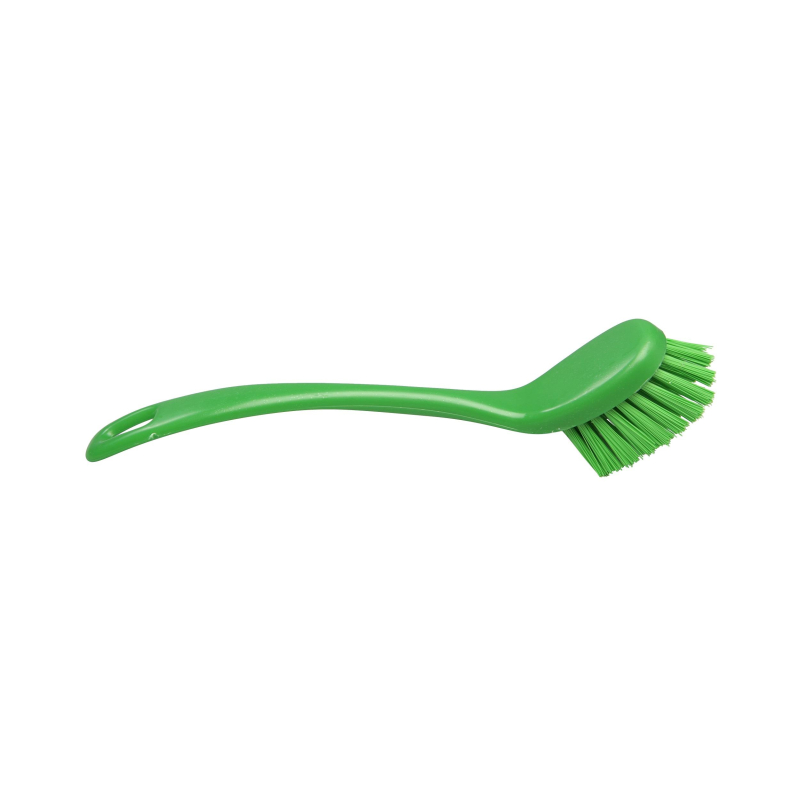 Щетка для мытья посуды FBK средней жесткости 225x35 мм зеленая Узкая и удлиненная ручная щетка средней жесткости с износостойкой 5-ти рядной щетиной с распущенными концами подходит для мойки посуды, гастроемкостей, труднодоступных мест, оборудования и любых поверхностей. Имеет сквозное отверстие для подвешивания. Соответствует требованиям ХАССП. Выдерживает температуры от -20°С до 134°С. Допустимо автоклавирование при температуре 134°С. Материал: щетина - полиэстер РBT, основание - высокоплотный полипропилен. Размеры: рабочая часть: 50х35 мм; щетина: средней жесткости, длина 25 мм, толщина 0,30 мм. Цвет: зеленый.