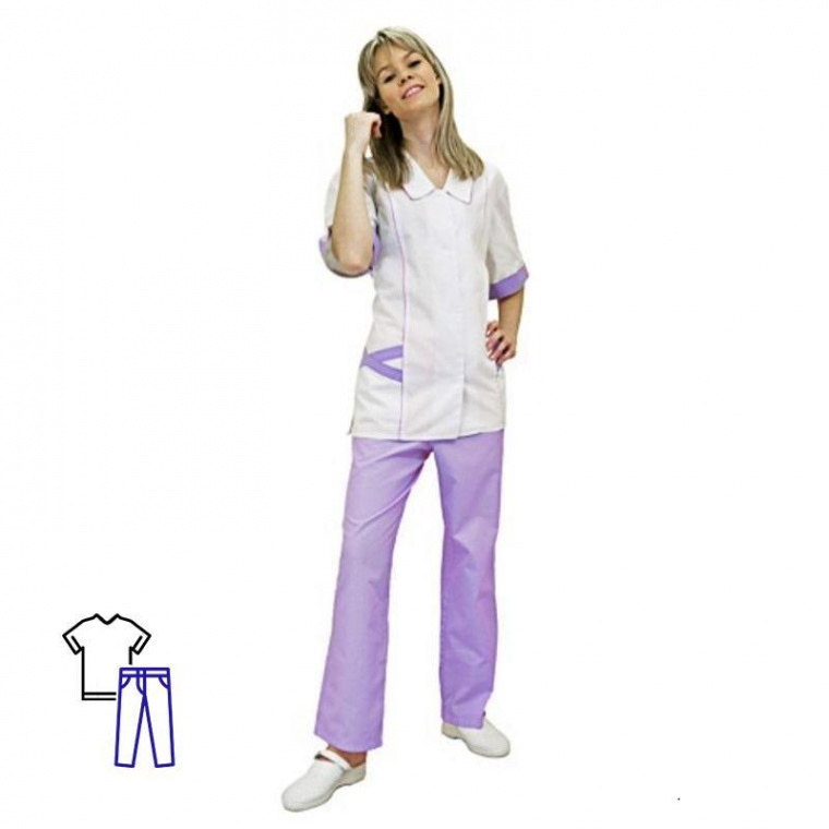 Костюм медицинский женский м03-КБР (размер 60-62, рост 158-164) состоит из жакета и брюк свободного покроя на резинке. Жакет застегивается на пуговицы, имеет два нижних кармана с отделкой. Цвет жакета — белый с фиолетовыми вставками, брюки фиолетового цвета. Костюм выполнен из ткани Ти-Си плотностью 120 г/кв. м, которая состоит из полиэфира (65%) и хлопка (35%). Ти-Си — материал, приятный на ощупь, гигиеничен и долговечен. Не мнется, легко и быстро стирается, быстро сохнет. Долго сохраняет свой первоначальный яркий цвет. Ткань «дышит», благодаря входящему в состав хлопку, имеет повышенный срок службы и проста в уходе, благодаря полиэфиру. Униформа рекомендована для сферы красоты и здоровья: медицинские учреждения, центры, салоны красоты.