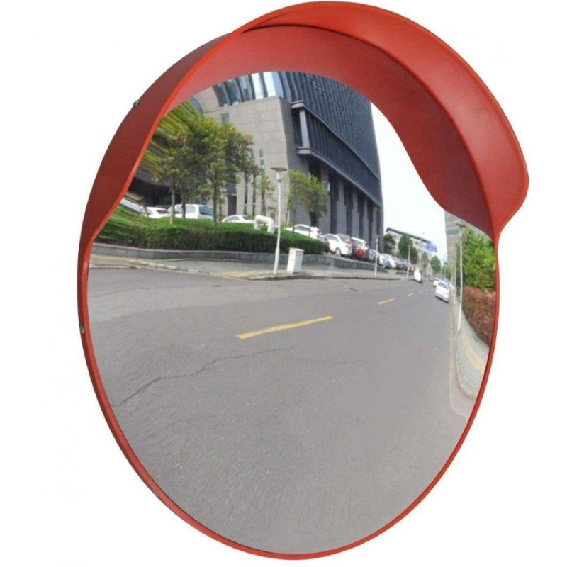 Дорожное сферическое зеркало диаметром 600 мм изготовлено из ударопрочного пластика. Для придания устойчивости с обратной стороны имеется вертикальная стенка с дополнительными ребрами жесткости. Зеркало оборудовано козырьком для защиты от солнца, снега или дождя. Конструкция крепится к металлической трубе. Зеркальная поверхность не изменяет своих свойств в условиях повышенной влажности, не боится жары и сильных морозов. Чаще всего большие выпуклые зеркала можно увидеть на автомобильных дорогах, поворотах, перекрестках и других опасных местах, где требуется дополнительный обзор проезжей части.