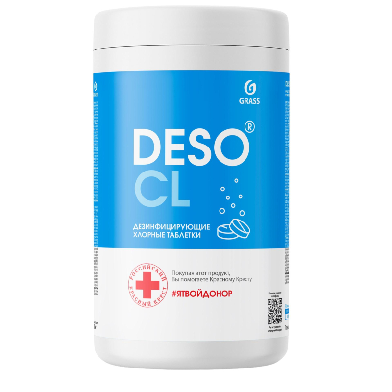 Дезинфицирующее средство с моющим эффектом Grass Deso CL 1 кг (300 таблеток). Назначение: Средство дезинфицирующее с моющим эффектом Deso CL таблетки для обеззараживания поверхностей в помещениях, жесткой мебели, санитарно-технического оборудования, систем мусороудаления, наружных поверхностей приборов и аппаратов, посуды, предметов для мытья посуды, ухода за больными, перевязочных материалов, средств личной гигиены, белья, уборочного инвентаря, крови, ликвора, выделений, смывных жидкостей, остатков пищи, уборочного инвентаря. Способ применения: Способ применения подробно изложен в инструкциях, разработанных ФБУН НИИ Дезинфектологии Роспотребнадзора по применению средства дезинфицирующего с моющим эффектом "DESO CL" № 004/21 от 16.07.2021 г. Состав: натриевая соль дихлоризоциануровой кислоты, ПАВ и функциональные компоненты. Массовая доля активного хлора не менее 45%. Масса активного хлора в одной таблетке 1.5 г. Срок годности: 5 лет с момента производства (при соблюдении условий хранения рекомендованных производителем).