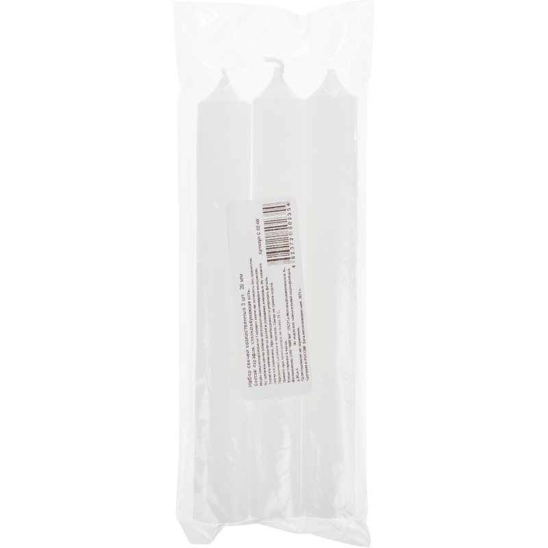 Набор свечей хозяйственных (3 штуки, 18х6.5 см). Набор хозяйственных свечей состоит из 3 классических неароматических свечей. Набор свечей украсит интерьер вашего дома, офиса или кафе и наполнит его атмосферу теплом и уютом. Мерцание свечи создаст располагающую атмосферу в любой момент - осветит темное зимнее утро, превратит обычный ужин в романтический и сделает комнату более уютной. Никогда не оставляйте горящую свечу не в поле зрения. Не зажигайте свечи рядом с воспламеняемыми материалами. Размер свечи: 6.5x6.5x18 см. Комплектация: Упаковка: 4 шт (вес одной свечи 38гр). Материалы: Свеча: парафиновый воск, Фитиль: хлопок.