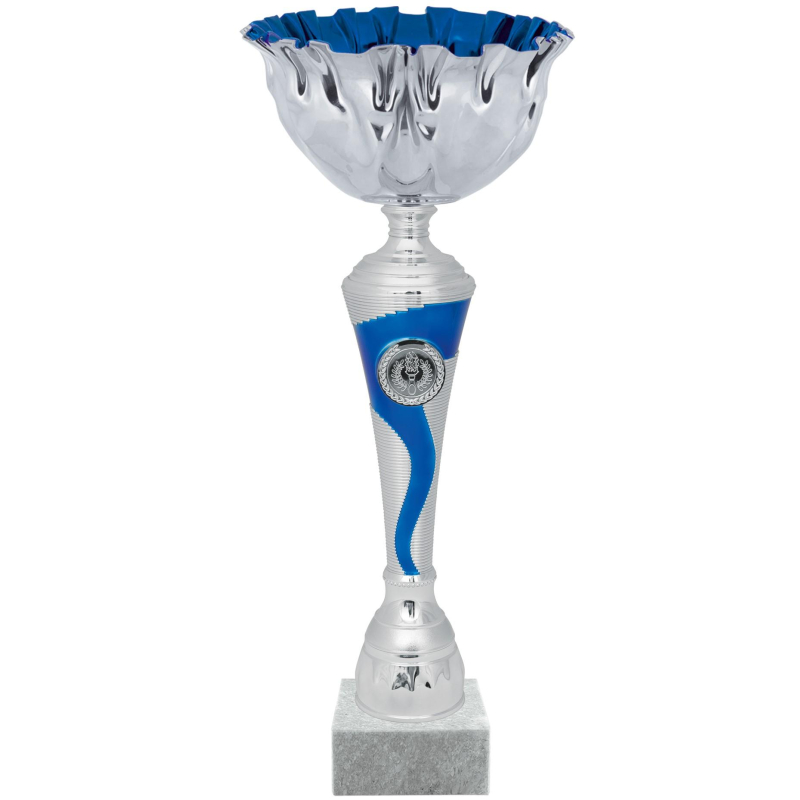 Кубок с двухцветной чашей в виде цветка. Внешняя поверхность чаши глянцевая серебристого цвета, внутренняя поверхность чаши глянцевая синего цвета. Металл верхнего края чаши собран в складочки, символизирующие лепестки распускающегося цветка.Стем сложносоставной, двухцветный, серебристый и синий. Соединительный элемент между чашей и стемом имеет форму шахматной фигуры пешки с широкой юбкой. Верхняя и нижняя часть стема конусообразные под серебро с рельефным декором по всей поверхности. Технология изготовления составных элементов стема - пластиковое литье с вакуумным напылением. Основная часть стема высокий конус серебристого цвета и рельефными горизонтальными полосами по всей поверхности, установленный широкой частью вверх. В центре конуса располагается место под эмблему (вкладыш диаметром не менее 25 мм) в рельефном венке из колосьев. Основная часть стема декорирована гладким глянцевым элементом в виде синей ленты. Узкая лента поднимается извиваясь, огибая место под эмблему, расширяясь к верху стема. Нижняя часть должна быть в виде конуса расширяющегося к основанию кубка. Рельеф: ярус с гладкой полированной поверхностью с шестью гранями, каждая грань в горизонтальном сечении - трапеция. Ниже располагается ярус в виде кольца с матовой поверхностью, ярус в виде узкого глянцевого кольца, широкое полированное кольцо и тонкое узкое кольцо. Ниже широкое кольцо с рельефными вертикальными полосами. Самый нижний элемент стема широкий восьмигранник. Кубическое основание выполнено из белого мрамора.Размеры основания: 30х75х75 мм.Параметры кубка (ВхШхГ): 330х75х75 мм.Размеры чаши: диаметр - 120 мм, высота - 60 мм.