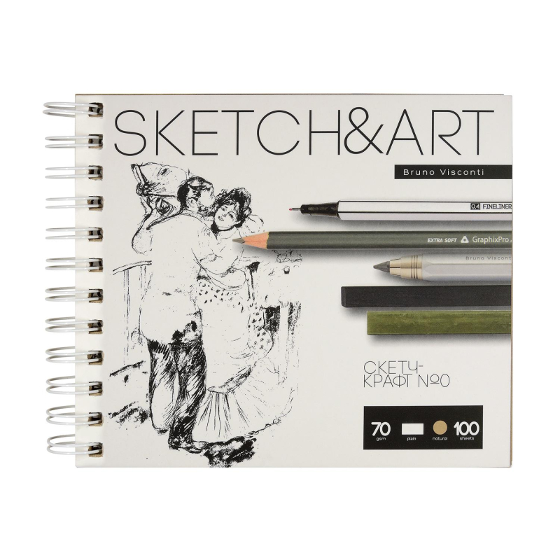 Скетчбуки серии Sketch&Art - отличное предложение как для профессионалов, так и для любителей рисования. Набор из 100 крафт-листов - это возможность создания большого количества рисунков углем, сепией, сангиной, соусом, графитным карандашом, линером, тушью в технике "сухая кисть", с применением сухой пастели и гелевых ручек. Качество и плотность бумаги (70 г/кв.м) позволяют работать с интенсивным фоном, создавать дополнительные изобразительные эффекты. Жесткая подложка дает возможность делать зарисовки и наброски на весу. Листы скетчбука скреплены спиралью, что позволяет переворачивать их на 180 градусов.
