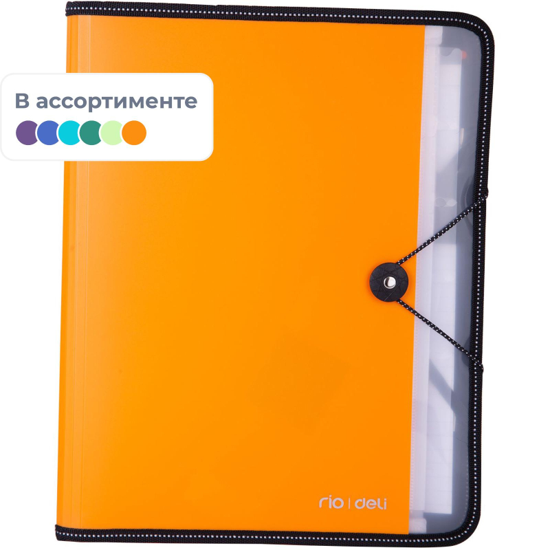 Папка Deli предназначена для хранения, систематизации и транспортировки документов, тетрадей, чертежей, рисунков, журналов. Папка для канцелярии изготовлена из прочного полипропилена толщиной 0,16мм,а толщина корешка 0,75 мм. Внутри 7 встроенных карманов гармошек с ярлычком рубрикатора. Долговечный материал имеет хорошую износостойкость, водонепроницаемый. На папке не видно отпечатков пальцев и мелких царапин, для безопасного использования по краям имеет тканевую окантовку. Сзади-карман для визитки. Папка вмещает до 200 бумажных листов. Портфель закрывается на удобную и безопасную резинку. Простой и быстрый доступ к бумагам обеспечивает широкое раскрытие папки, а клапан с резинкой надежно удержит документы от выпадения при транспортировке. Папка для канцелярии выполнена в пяти ярких тонах: зеленом, синем, розовом, оранжевом, желтом. В комплект входит блокнот в линеечку для записей формата А4 на 30 листов. Отличное и портативное решение для школьников младших, старших классов и студентов. Формат: А4 Размер: 330х240х25мм.