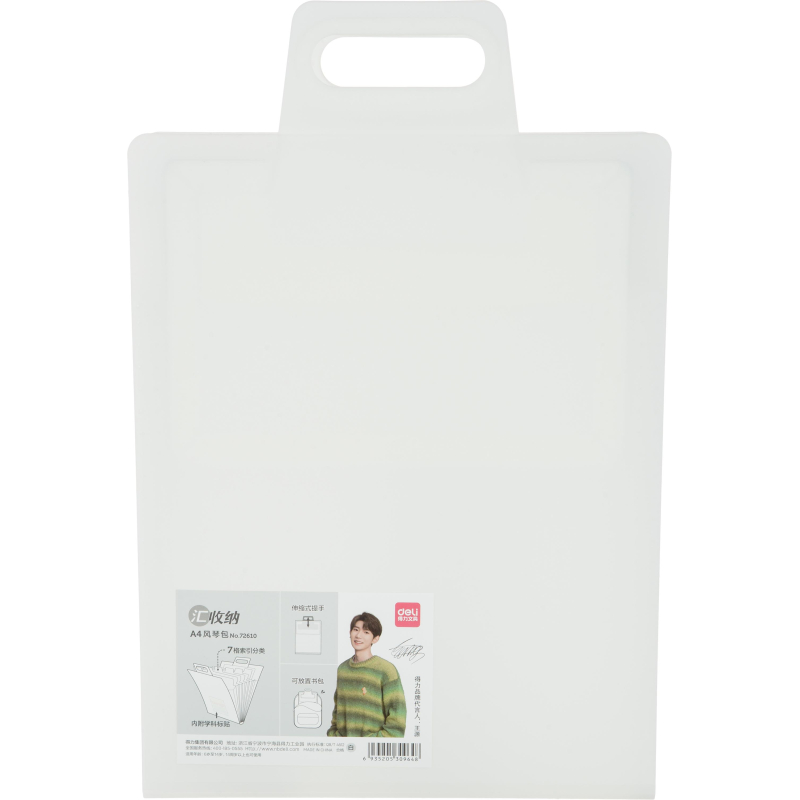 Оригинальная вертикальная папка-портфель Deli с выдвижными ручками для документов. Папка изготовлена из прозрачного полипропилена. Долговечный материал имеет хорошую износостойкость, водонепроницаемый. На папке не видно отпечатков пальцев и мелких царапин. Содержит 7 встроенных отделений, которые позволяют структурировать документы, а индексные ярлыки помогут вам легко и быстро найти нужный файл. Большое количество отделений упрощает систематизацию хранения. Папка предназначена для транспортировки документов, бумаг и различных предметов. Вмещает до 200 листов стандартной плотности. Ваши документы будут надежно сохранены. Ручки изготовлены из пластика. Отличное и портативное решение для хранения и переноски тетрадей, журналов, рисунков. Органайзер для документов окажется полезен в дороге или путешествии, кроме этого портфель легко и удобно брать с собой в командировки. Приятный и оригинальный дизайн порадует каждого покупателя. Формат: А4 Цвет: белый Размер: 315х257мм Ориентация: вертикальная