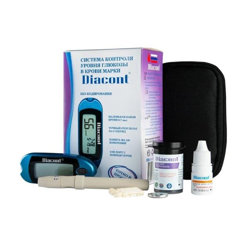 Глюкометр Diacont Компакт 3588. Размер: 90,5 x 35 x 21. Вес/г: 38. Метод измерения: электрохимический. Кодирование не требуется. Время измерения в сек: 6. Калибровка по плазме. Объем капли крови мкл: 0,7. Есть функция среднего результата: за 7, 14,28 дней. Связь с ПК USB порт, объем памяти (ко-во): 120. Диапазон измерений ммоль/л: 1,1-33,3 ммоль/л. Автоматическое вкл/отк: есть. Элемент питания: 1 батарейка CR2032. Условия проведения теста (температура, влажность): 10С-40С, 10-85 %. Условия хранения и транспортировки: ( 4С-40С) , 10-85 %. Альтернативные места прокола: ладони, плечи, голени, бедра. Единицы измерения: ммоль/л. Время теста: 6 секунд. Комплект системы включает : глюкометр, 10 - тест полосок, автоматический скарификатор, 10 стерильных ланцетов, контрольный раствор, батарейка, инструкция по использованию, футляр. При концентрации глюкозы в крови < 5,55 ммоль/л разброс результатов составляет +/-3% (+/-0,43 ммоль/л). При концентрации глюкозы в крови> 5,5 ммоль/л, разброс результатов составляет +/-15% (+/-0,83 ммоль/л) в сравнении с показателями, полученными на лабораторном оборудовании.